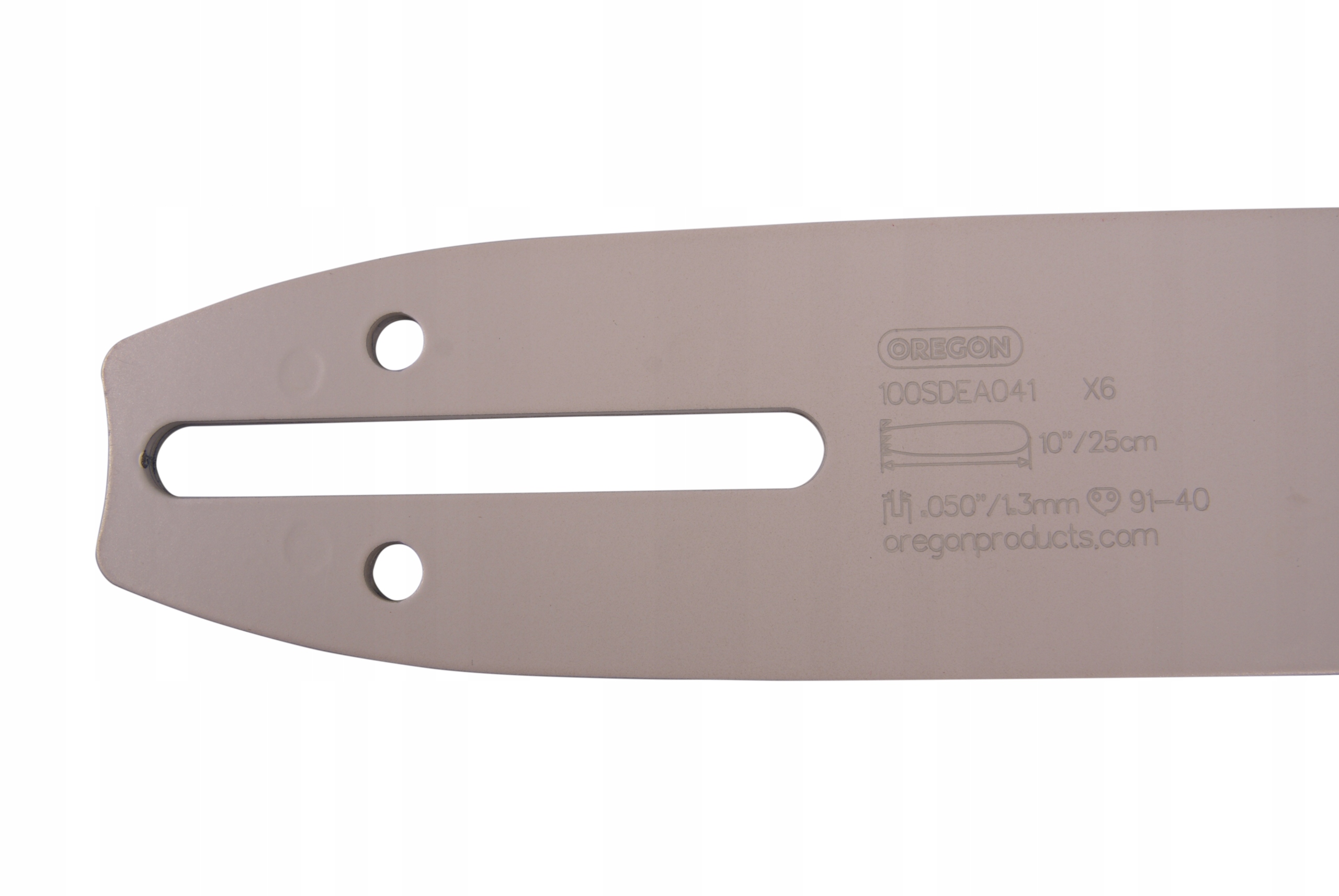 Prowadnica Oregon 100SDEA041 o długości 25 cm (10 cali) i szerokości rowka 1,3 mm to wysokiej jakości komponent przeznaczony do użycia z mniejszymi pilarkami łańcuchowymi. Jest to model z serii Single Rivet, który charakteryzuje się prostotą montażu i solidnością konstrukcji, zapewniając stabilność oraz efektywność cięcia.