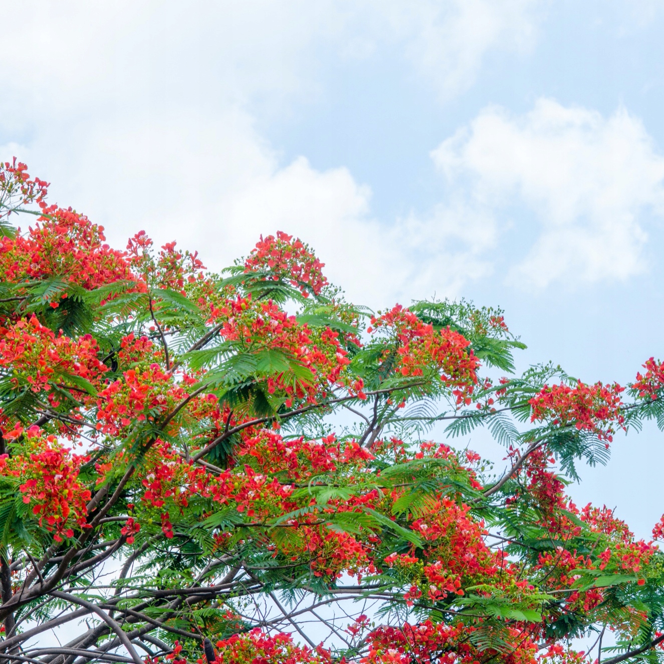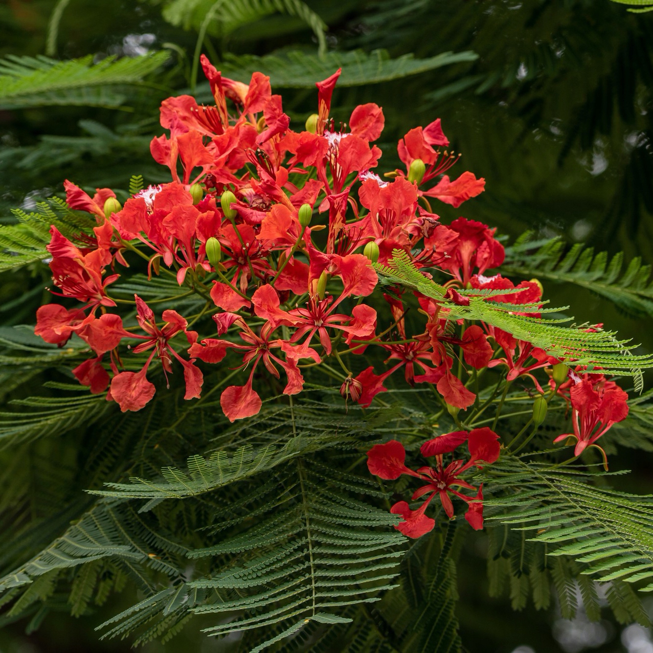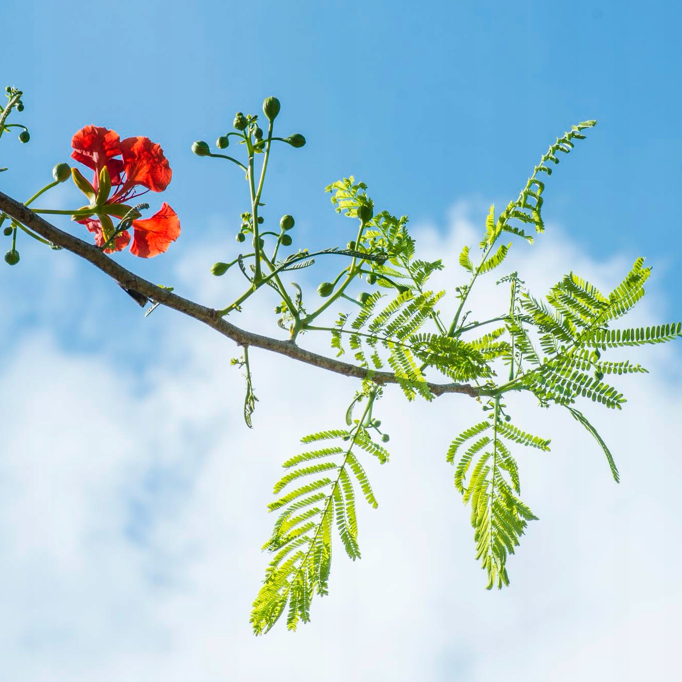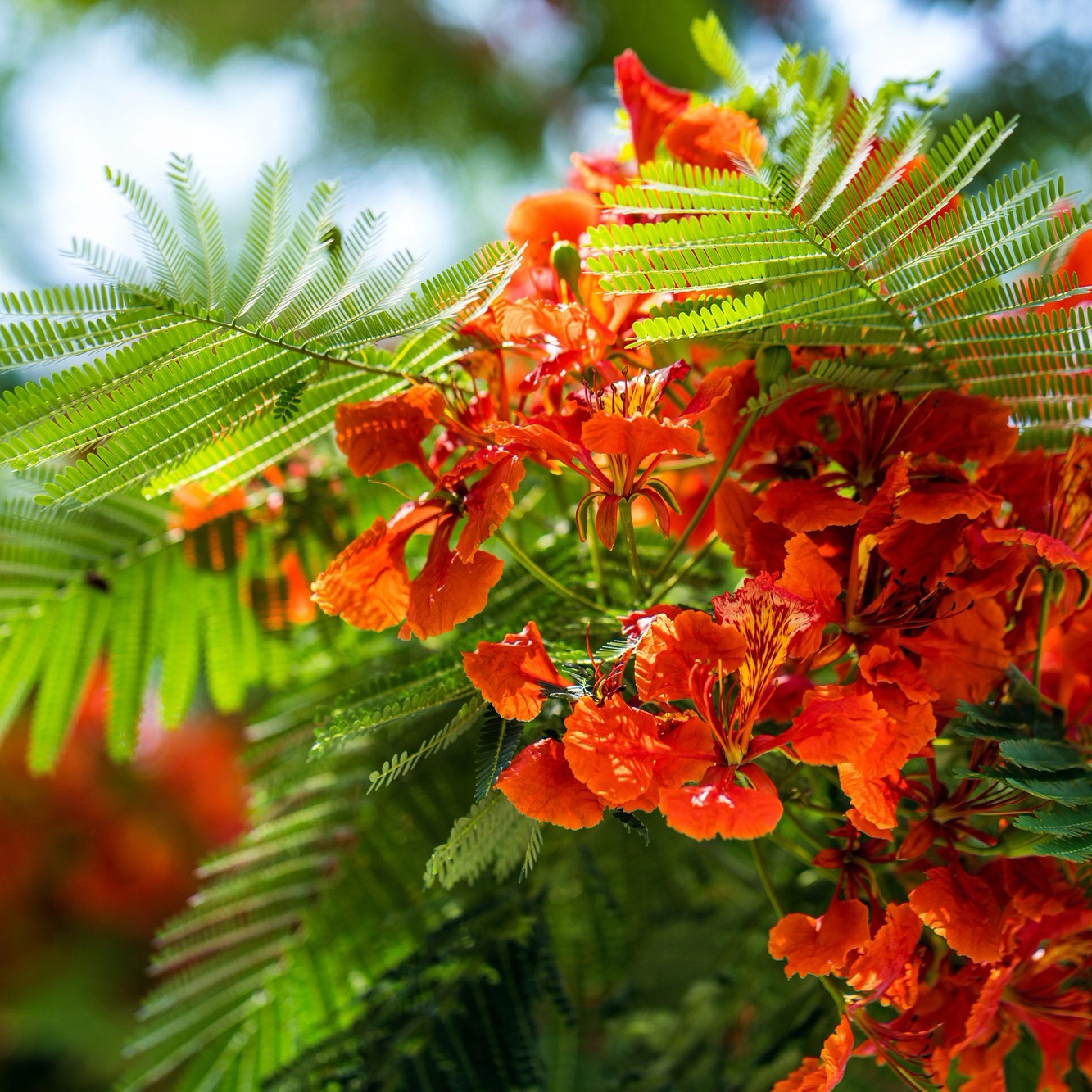 Delonix regia, это красивое и эффектное лиственное дерево, происходящее из Мадагаскар. Он характеризуется крупными перистыми листьями и эффектными красными или оранжевыми цветами, которые появляются во время цветения, создавая удивительное зрелище, которое это привлекает внимание.