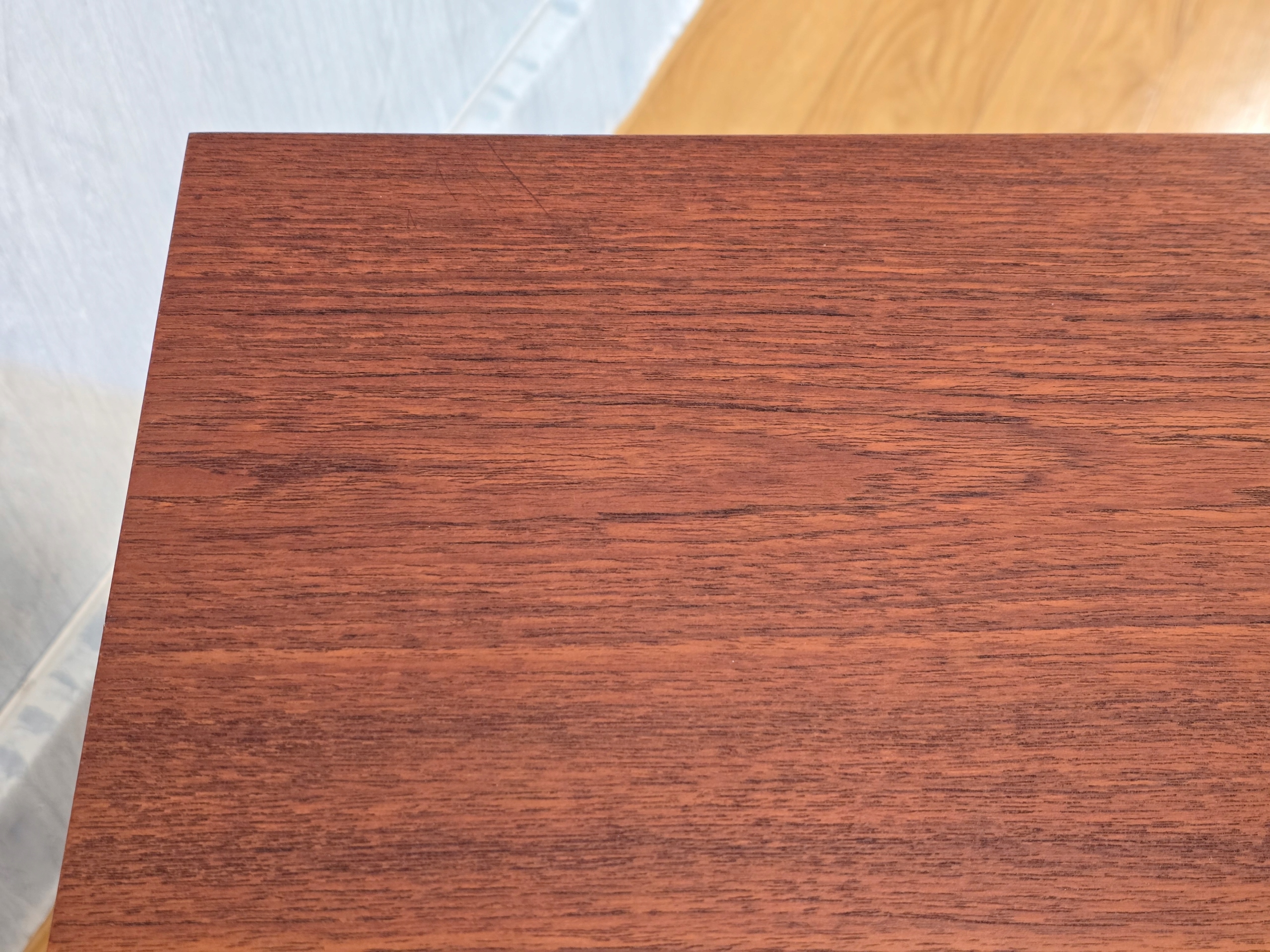 Konstrukcja mebla sztywna, stabilna wykonana z drewna oraz elementów drewnianych, fornirowana teakiem, niewielkie ślady użytkowania (minimalne ryski) - patrz foto.