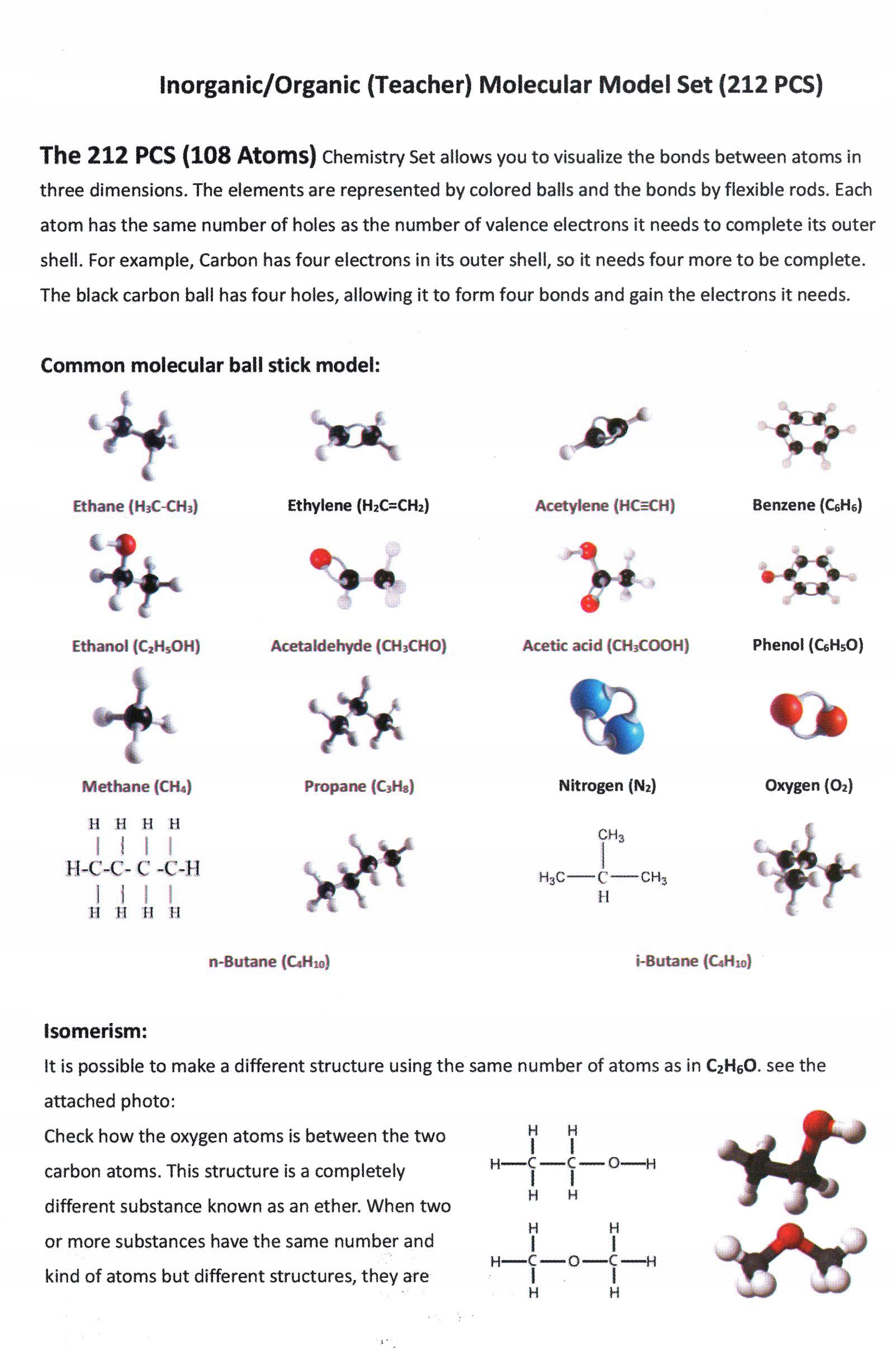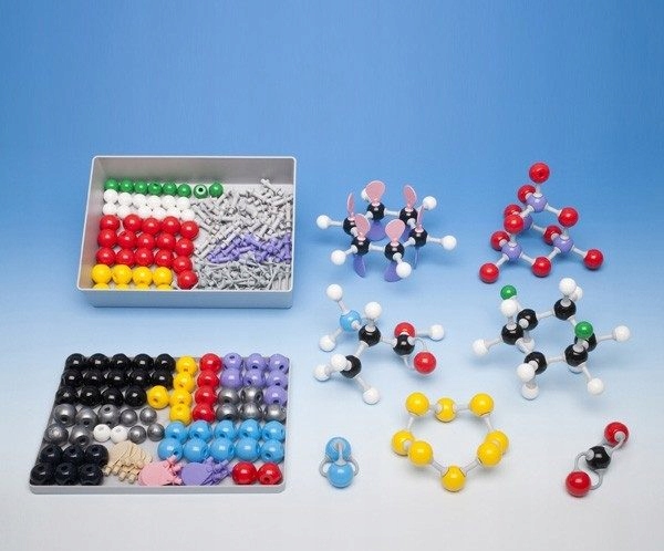DUŻY ZESTAW DO CHEMII ORGANICZNEJ I NIEORGANICZNEJ, zestaw zawiera 212 elementy, umożliwiające budowę bardzo szerokiej gamy struktur. W zestawie znajdują się modele takich pierwiastków jak węgiel, wodór, azot, tlen, siarka, fosfor, fluorowce i metale oraz 3 rodzaje łączników symbolizujących wiązania (m.in. pojedyncze kowalencyjne, podwójne, potrójne, koordynacyjne i jonowe).Z elementów zestawu można budować m.in.: cząsteczki (np. wodoru, chloru, tlenu, ozonu, azotu, fosforu, siarki, węgla - różne odmiany alotropowe), wodorki (np. sodu, magnezu, krzemu oraz chlorowodór, amoniak, metan, woda, siarkowodór), chlorki i fluorki, tlenki metali, tlenki niemetali, kwasy, jony metali, związki organiczne (np. benzen, glicerol, etan, eten, etyn, etanol, itd.). Zbudowane struktury są duże, a co ważniejsze - wyraźne i przejrzyste.
