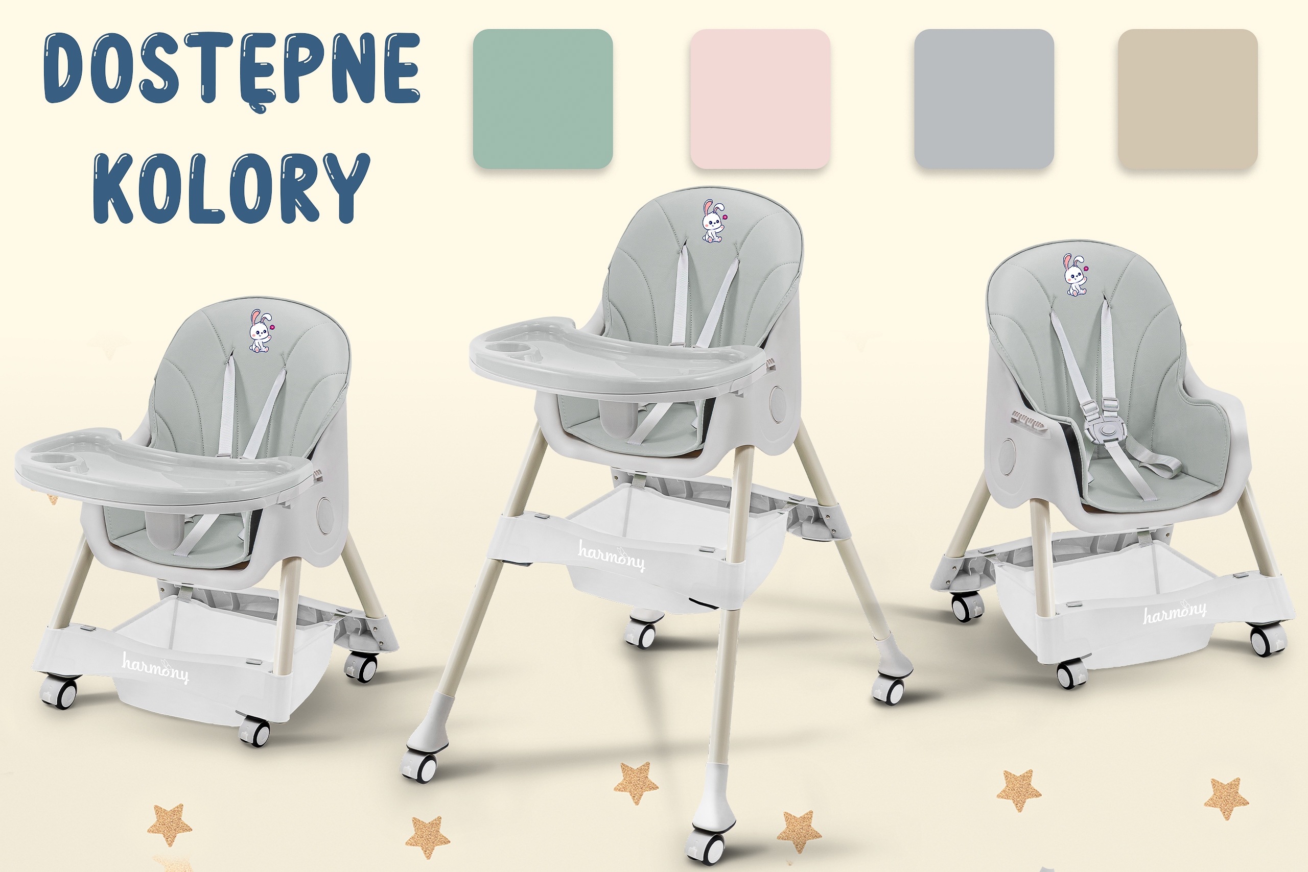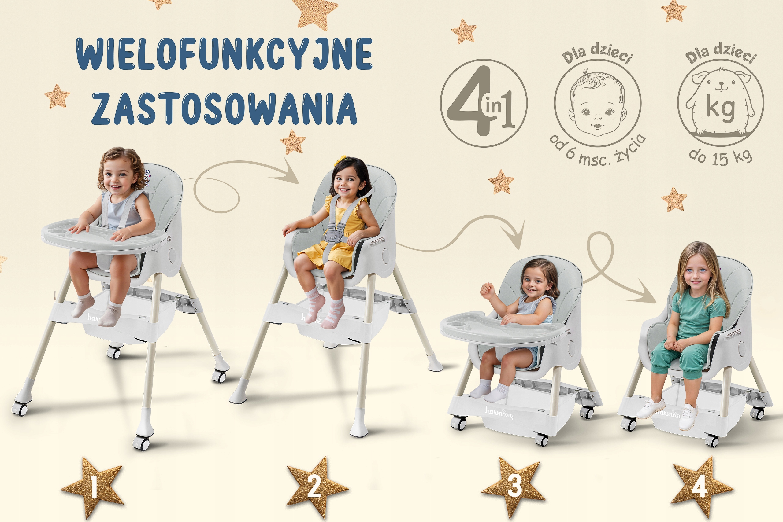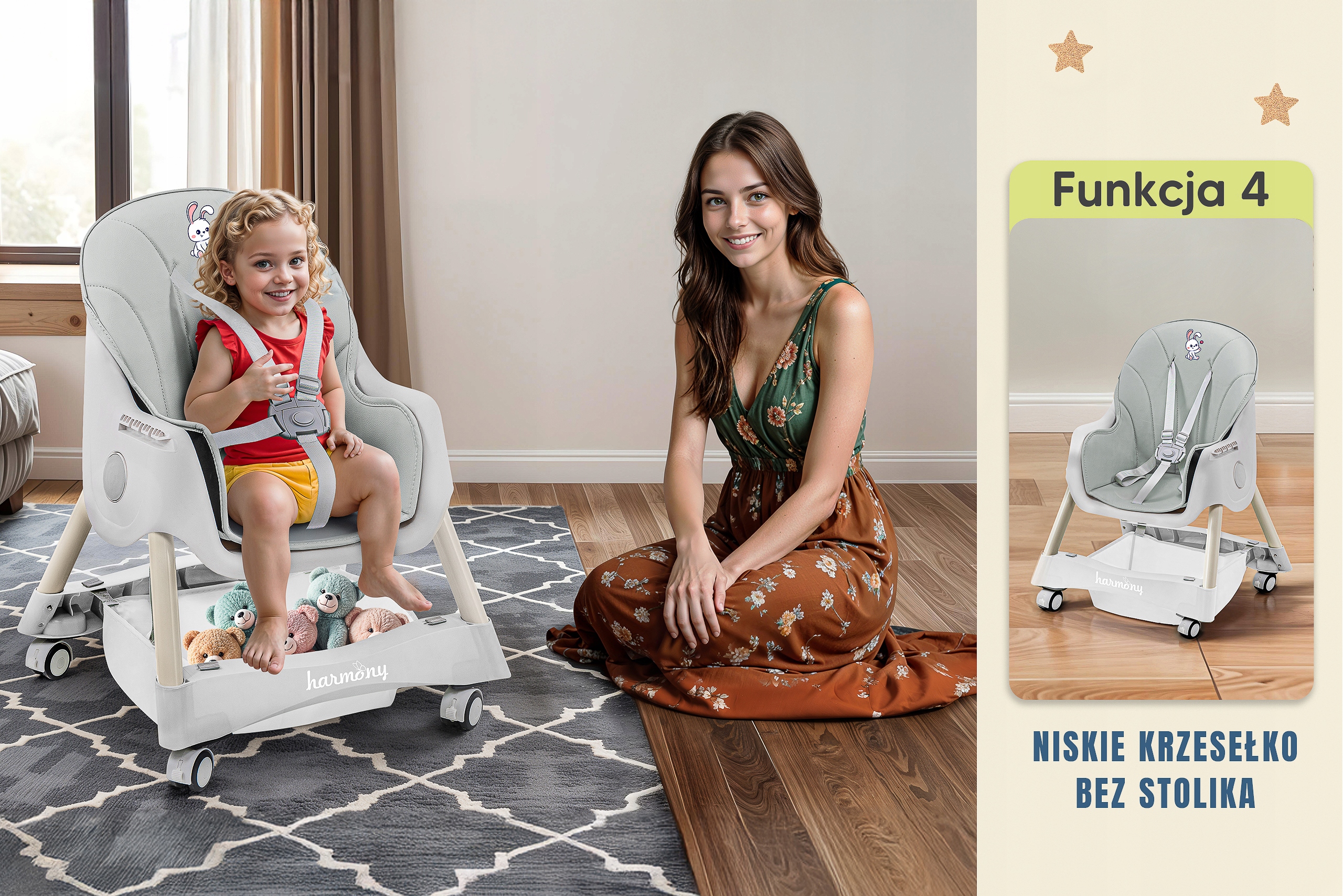 Krzesełko do karmienia 4w1 HARMONY CYNAMONEK. Bycie rodzicem to codzienne wyzwania, dlatego stworzyliśmy krzesełko HARMONY CYNAMONEK, które ułatwi Ci opiekę nad dzieckiem. To innowacyjne, wielofunkcyjne krzesełko 4w1 rośnie razem z Twoim dzieckiem i dostosowuje się do jego zmieniających się potrzeb. Dzięki czterem trybom użytkowania – od wysokiego krzesełka z tacką po niskie, wolnostojące krzesełko – codzienne czynności stają się prostsze i mniej czasochłonne. HARMONY CYNAMONEK będzie Twoim niezawodnym wsparciem na każdym etapie rozwoju dziecka.
