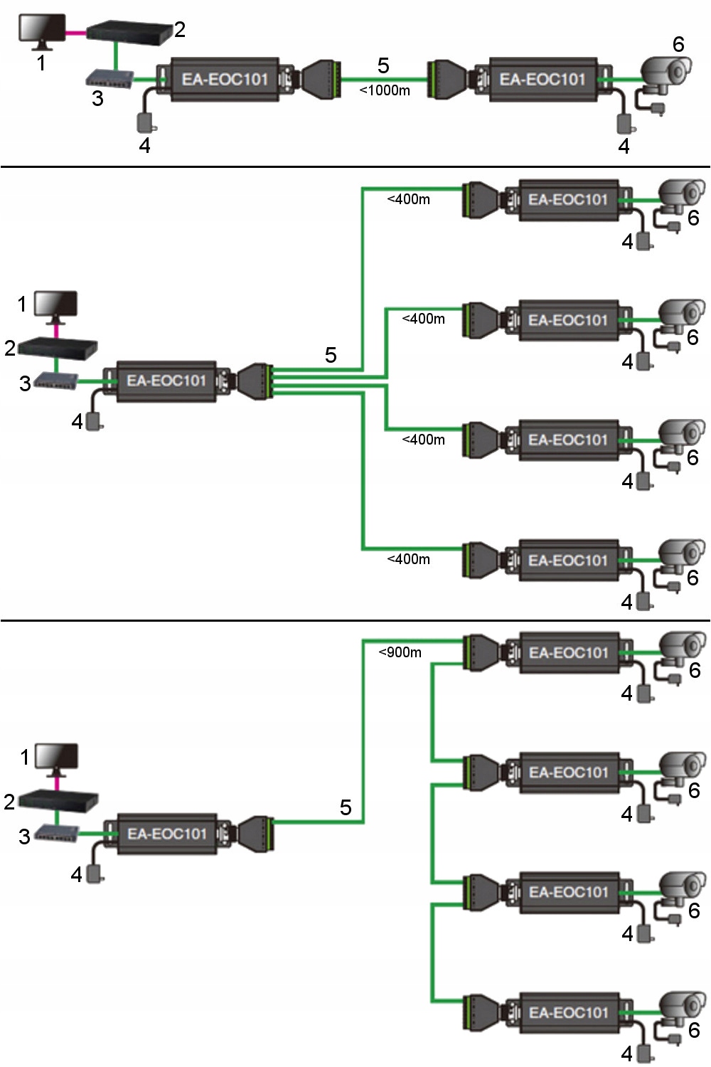 Extender EA-EOU101 pozwala na wydłużenie transmisji danych za pomocą kabla UTP na odległość do 1000m. Urządzenie jest nadajnikiem jak i odbiornikiem w jednym module (transceiver). Uwaga! Do prawidłowej pracy urządzenia wymagane są minimum 2 szt. EA-EOU101. Urządzenie pracujące po stronie switcha pozwala podłączyć do 4 urządzeń EA-EOU101 pracujących po stronie kamer IP. Po odłączeniu konwertera BNC / UTP, urządzenie ma funkcjonalność extendera EA-EOC101 i jest z nim w pełni kompatybilne.
