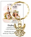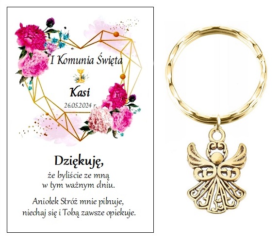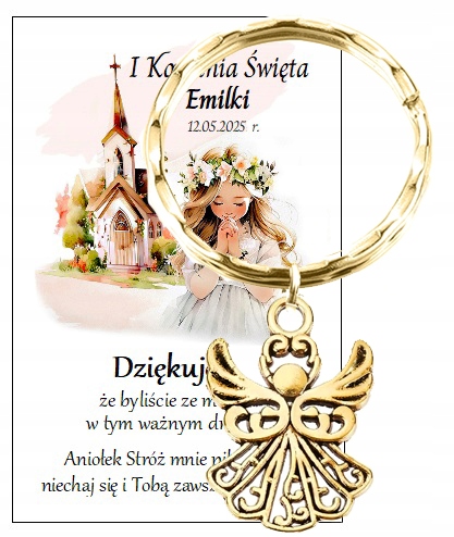 PAMIĄTKA UPOMINEK PREZENT PODARUNEK DLA GOŚCI Z OKAZJI KOMUNII ŚWIĘTEJ - KARTECZKA Z PODZIĘKOWANIEM I BRELOCZKIEM ZŁOTYM ANIOŁKIEM