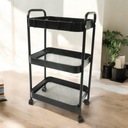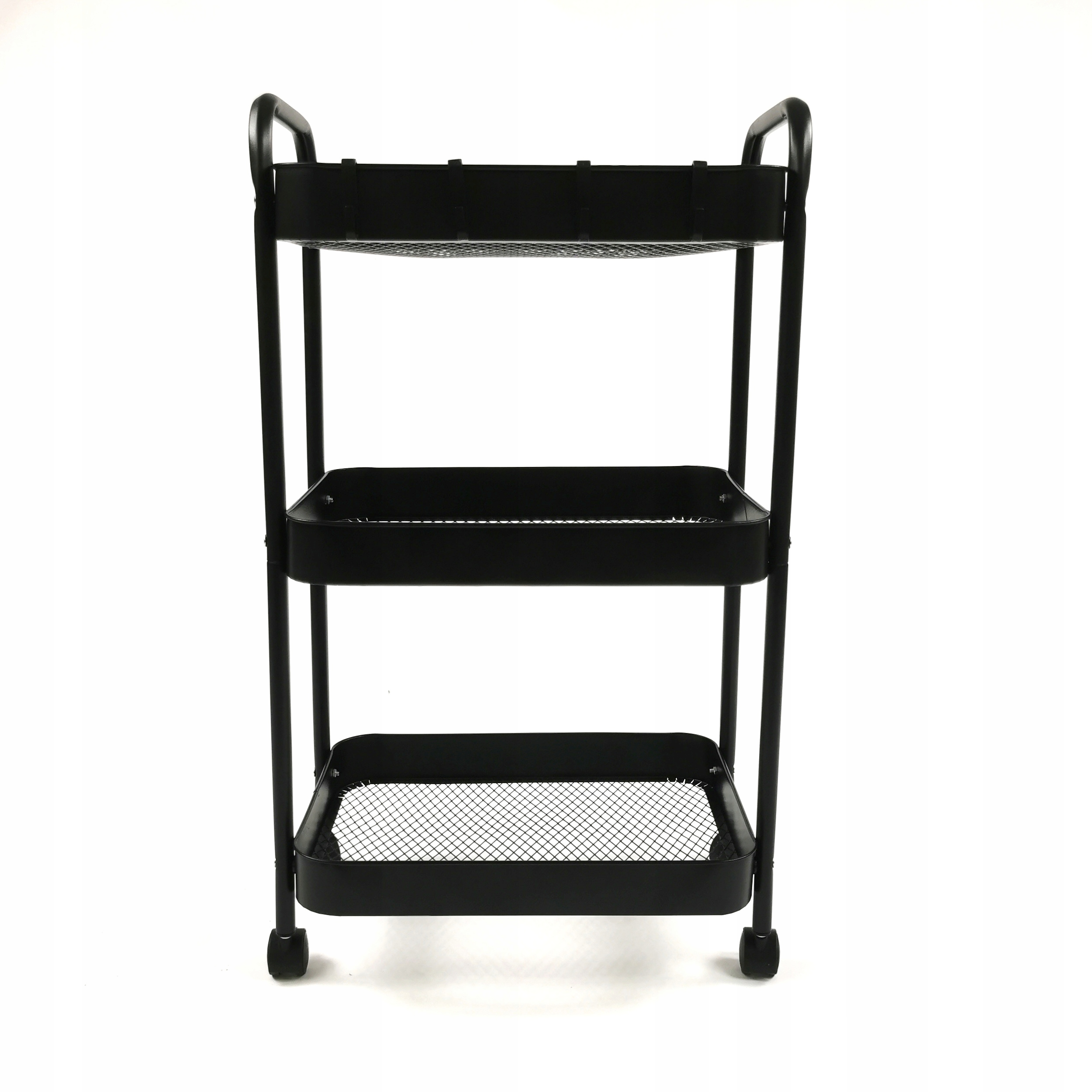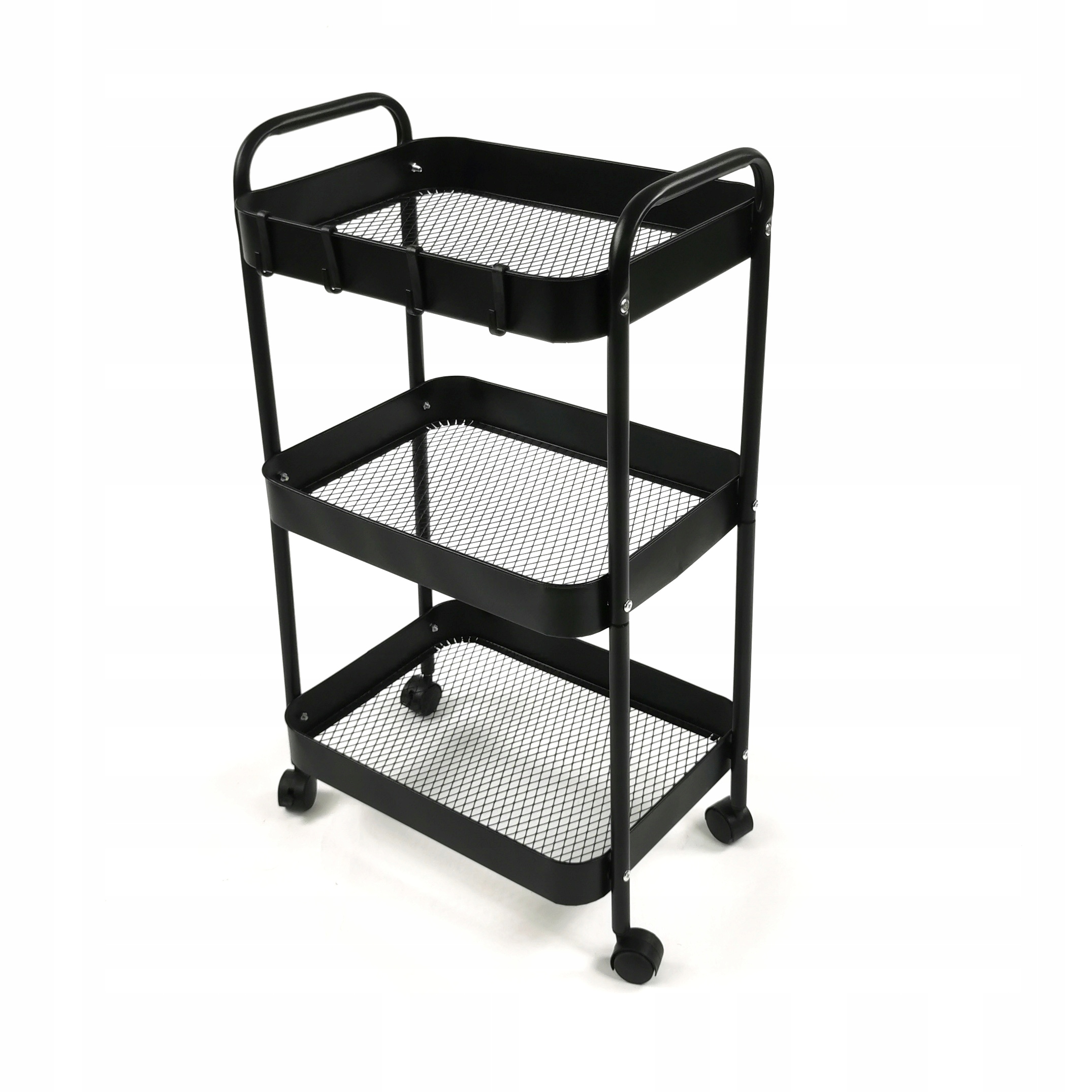 Praktyczny i stylowy wózek 3-poziomowy, wykonany z trwałego metalu w eleganckim czarnym kolorze. Dzięki trzem pojemnym półkom z siatkowym dnem idealnie nadaje się do przechowywania i organizacji różnych przedmiotów w domu, biurze lub warsztacie.