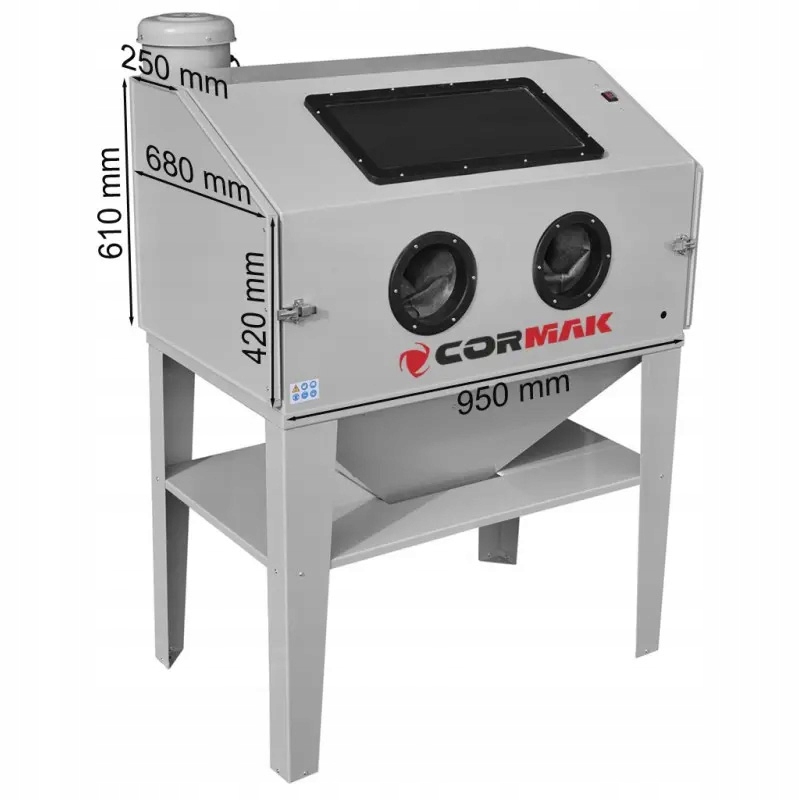 Maszyna wyposażona została w sprawdzony system sterowania, solidną i pojemną komorę z bocznym załadunkiem, solidny pistolet do piaskowania, dysze ceramiczne, wysokojakościowe rękawice robocze, oświetlenie przestrzeni roboczej, duże okno - wizjer (bez martwego pola) oraz odciąg cyklonowy.