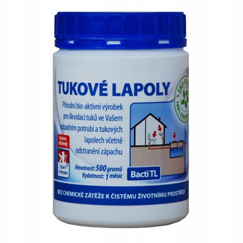 Jest to mieszanka bakterii i enzymów przeznaczonych do rozkładu tłuszczów w systemie ściekowym i syfonie. Produkt rozkłada tłuszcz, złogi tłuszczu i utrzymuje prawidłowe działanie lapolu tłuszczowego. Regularne stosowanie zapobiega wytrącaniu się tłuszczów po wewnętrznych stronach rur ściekowych, twardnieniu tłuszczów i zatykaniu odpadów systémů.Zabraňuje ewentualnemu ponownemu osadzaniu się roślinnych lub zwierzęcych związków tłuszczowych. Produkt bakteryjny Bacti TL całkowicie eliminuje typowy ostry zapach z rozkładających się tłuszczów.