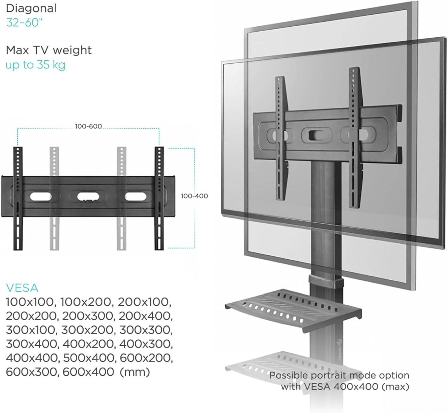 Pasuje do praktycznie wszystkich nowoczesnych ekranów – LCD, LED, OLED, Ultra HD, zakrzywionych i płaskich ekranów ze standardami montażu VESA: 100 x 100 mm, 200 x 100 mm, 200 x 200 mm, 400 x 400 mm, 600 x 200 mm i do 600 x 400 mm.