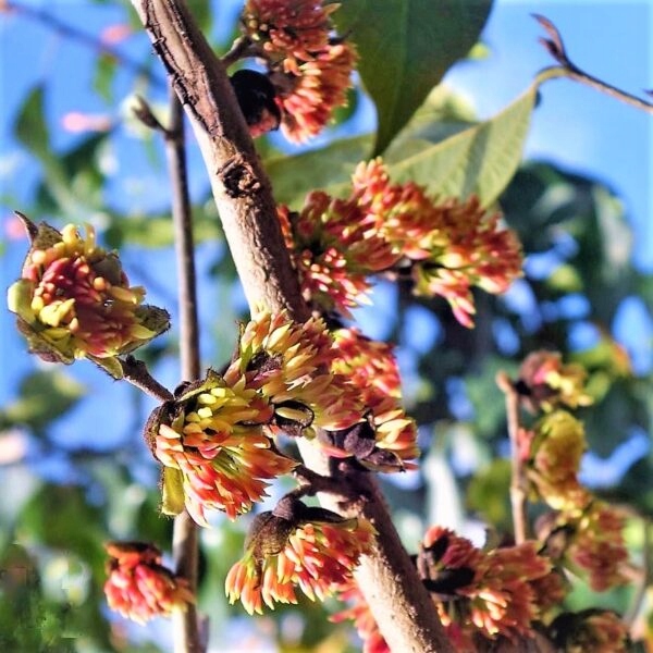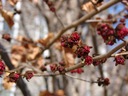 Kwiaty składają się z ciemnoczerwonych pręcików otoczonych brązowymi podkwiatkami, a rozkwitają przed rozwojem liści w marcu i kwietniu.