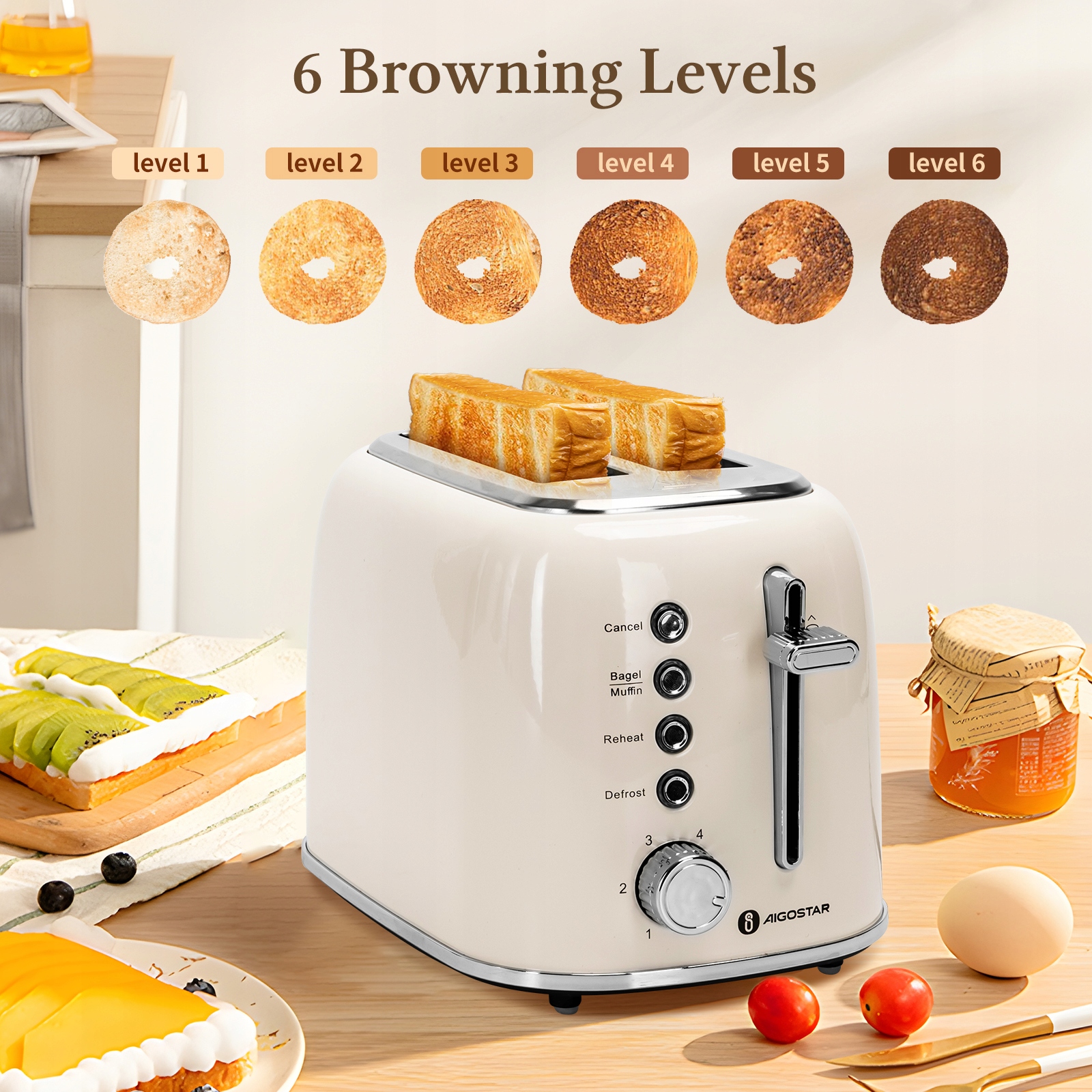 Toster został wyposażony w 6-stopniową regulację mocy , która pozwala dostosować poziom opiekania do indywidualnych preferencji: od stopnia 1 – lekko przypieczony, po 6 – mocno przypieczony. Niezależnie od tego, czy wolisz lekko złociste, czy mocno chrupiące tosty , Cream zawsze spełni Twoje oczekiwania. Dzięki mocy 800W opiekanie odbywa się szybko i równomiernie.