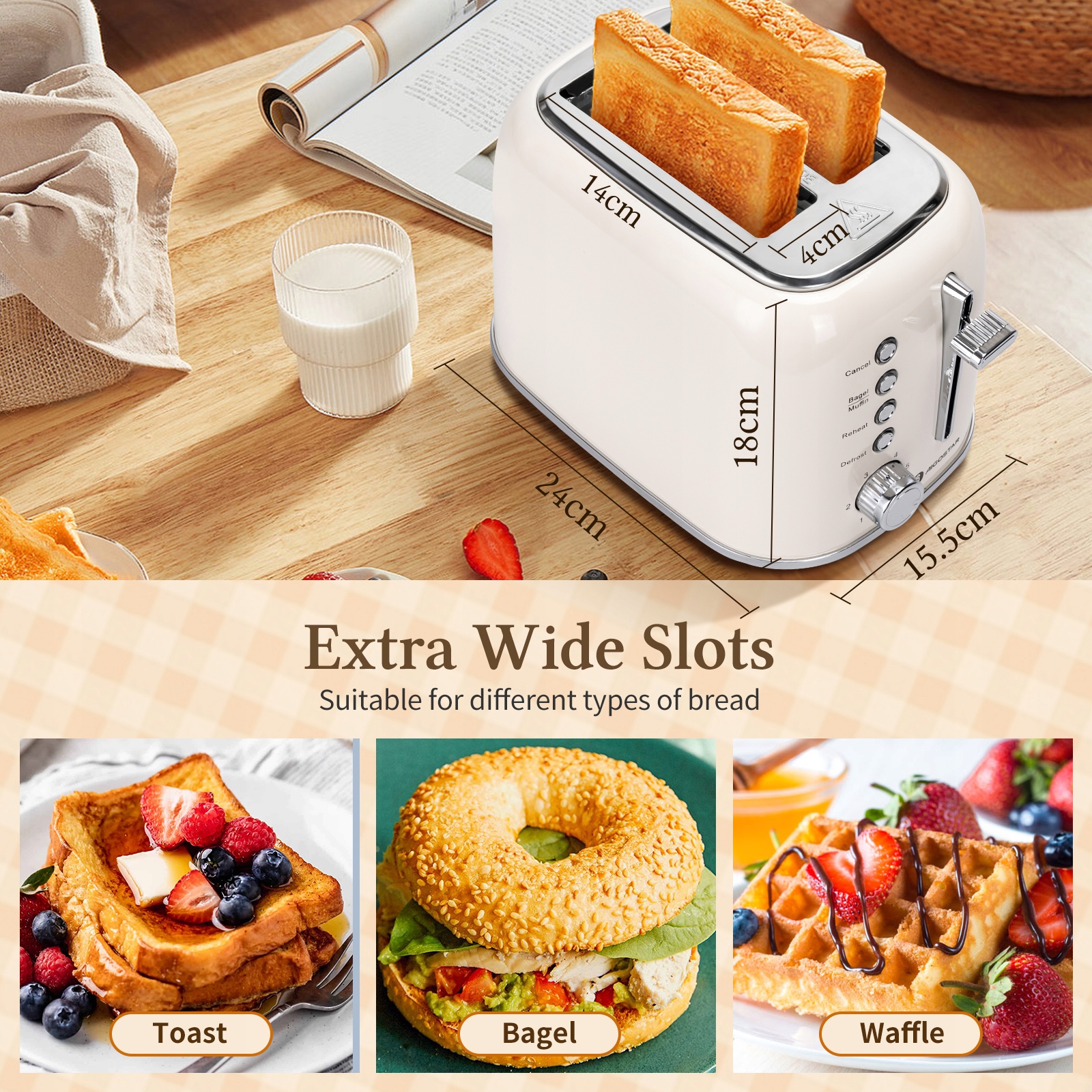 2 duże otwory pozwalają opiekać pieczywo różnej wielkości. Dzięki wyśrodkowanym otworom chleb zawsze znajduje się pośrodku, co umożliwia jego równomierne opiekanie.