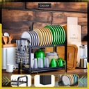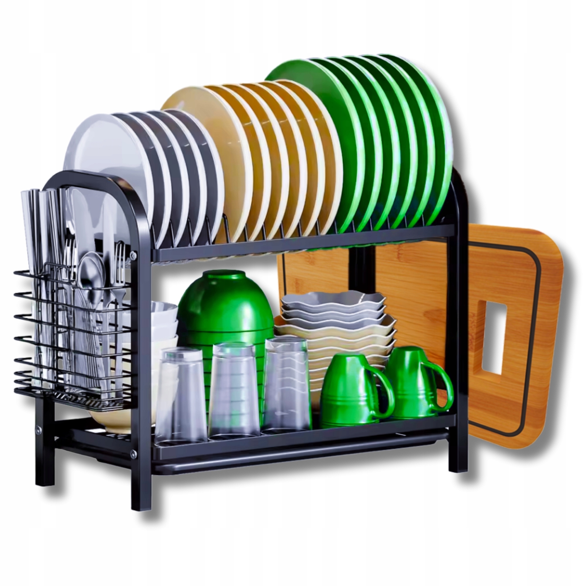Koniec z górą naczyń w zlewie! Dzięki dwupoziomowej konstrukcji, suszarka pomieści do 15 talerzy i 8 misek lub więcej jeśli jesteś mistrzem układania – idealna zarówno do codziennego użytku, jak i większych rodzinnych posiłków. Boczny organizer na sztućce i uchwyt na deskę sprawiają, że wszystko ma swoje miejsce.