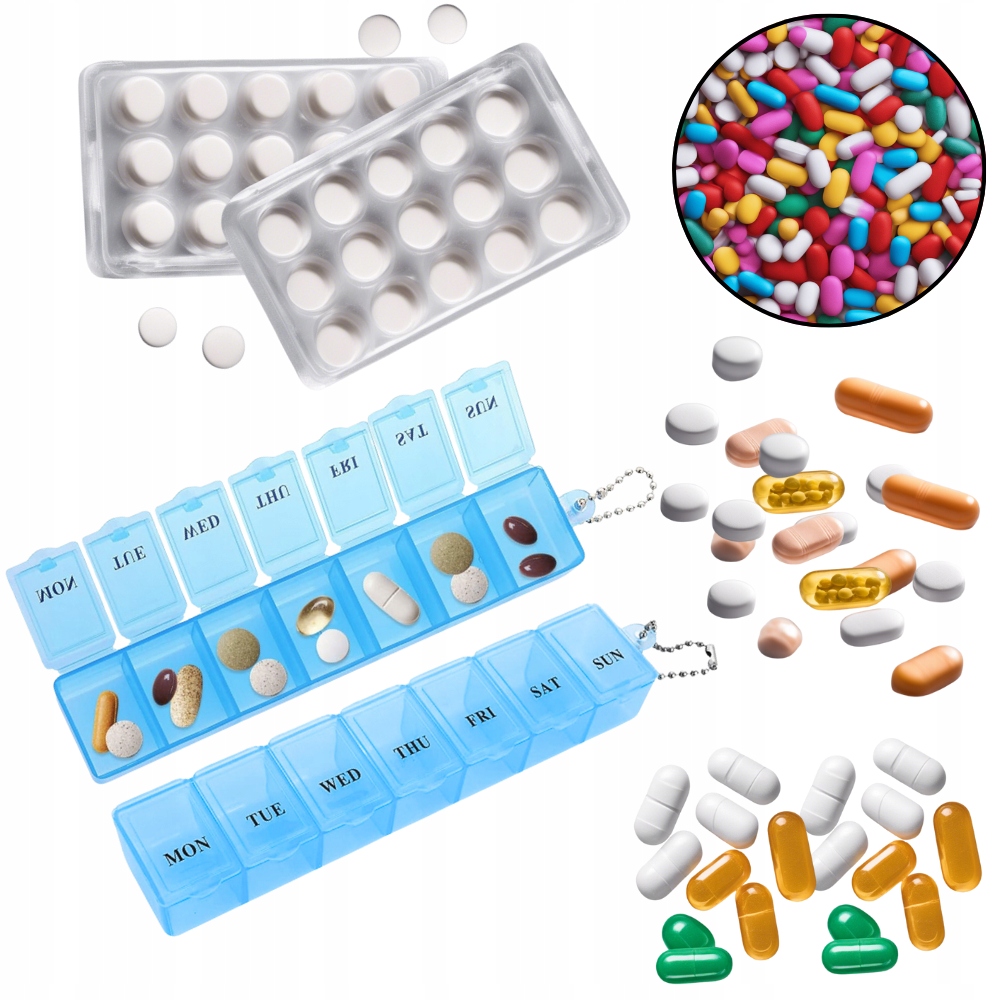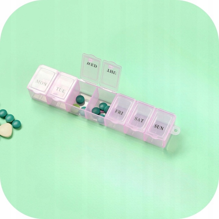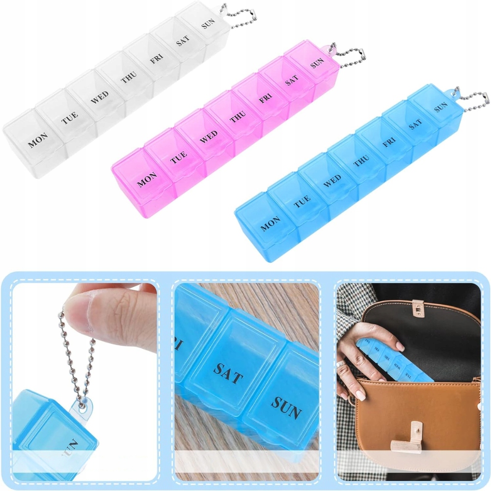 ➡️ Tygodniowy pojemnik na lekarstwa to zestaw siedmiu plastikowych przegródek w jednej zbiorczej kasetce. Idealne rozwiązanie aby przygotować leki na cały tydzień, szczególnie dla osób przewlekle chorych. Zamiast kilku opakowań leków można schować je wszystkie w mały pojemniczek, który mamy zawsze przy sobie. Poszczególne przegródki podpisane są nazwą dnia tygodnia. Pudełeczko na leki jest półprzezroczyste, dzięki czemu widzimy, które tabletki zostały już wykorzystane.