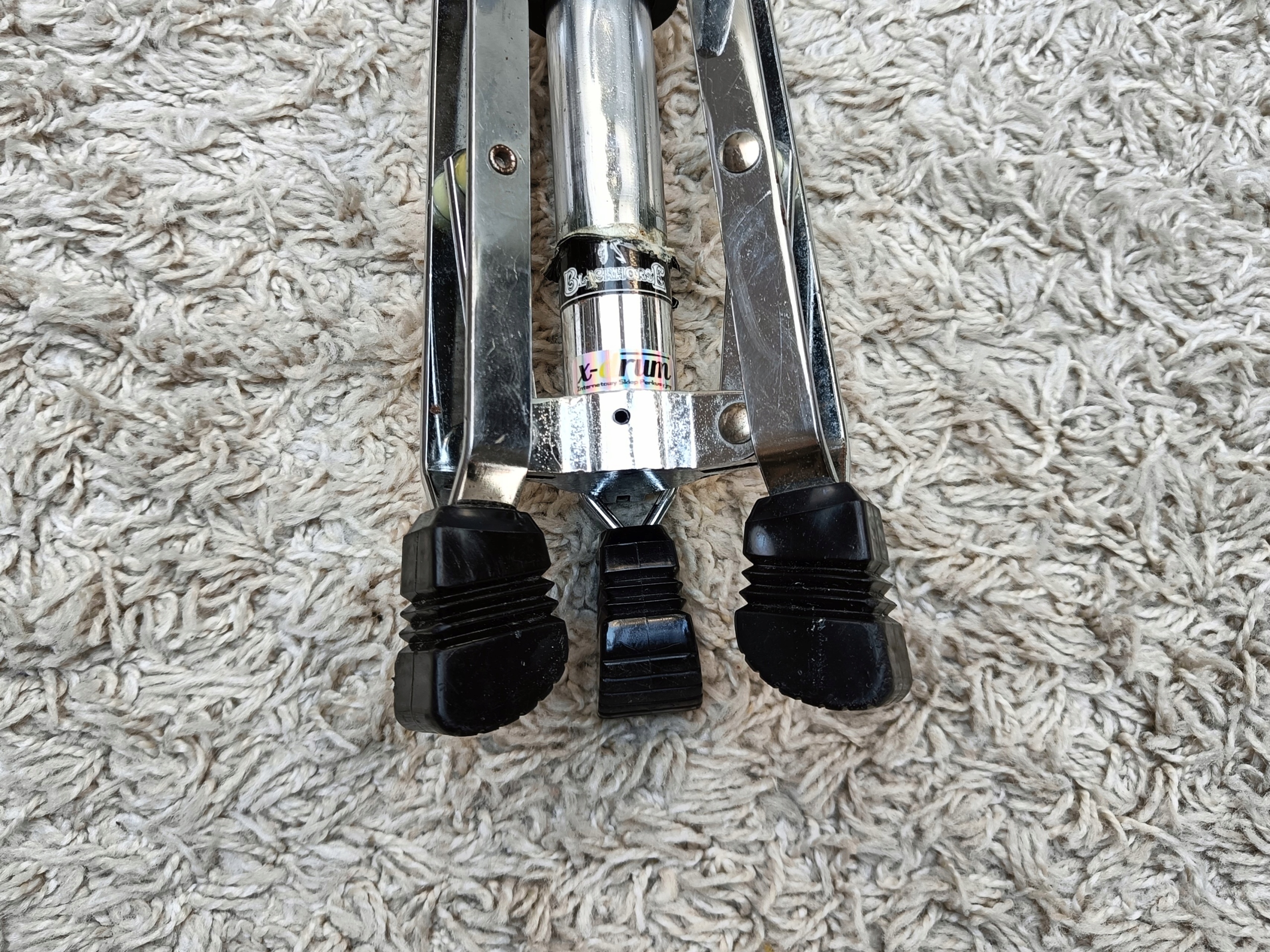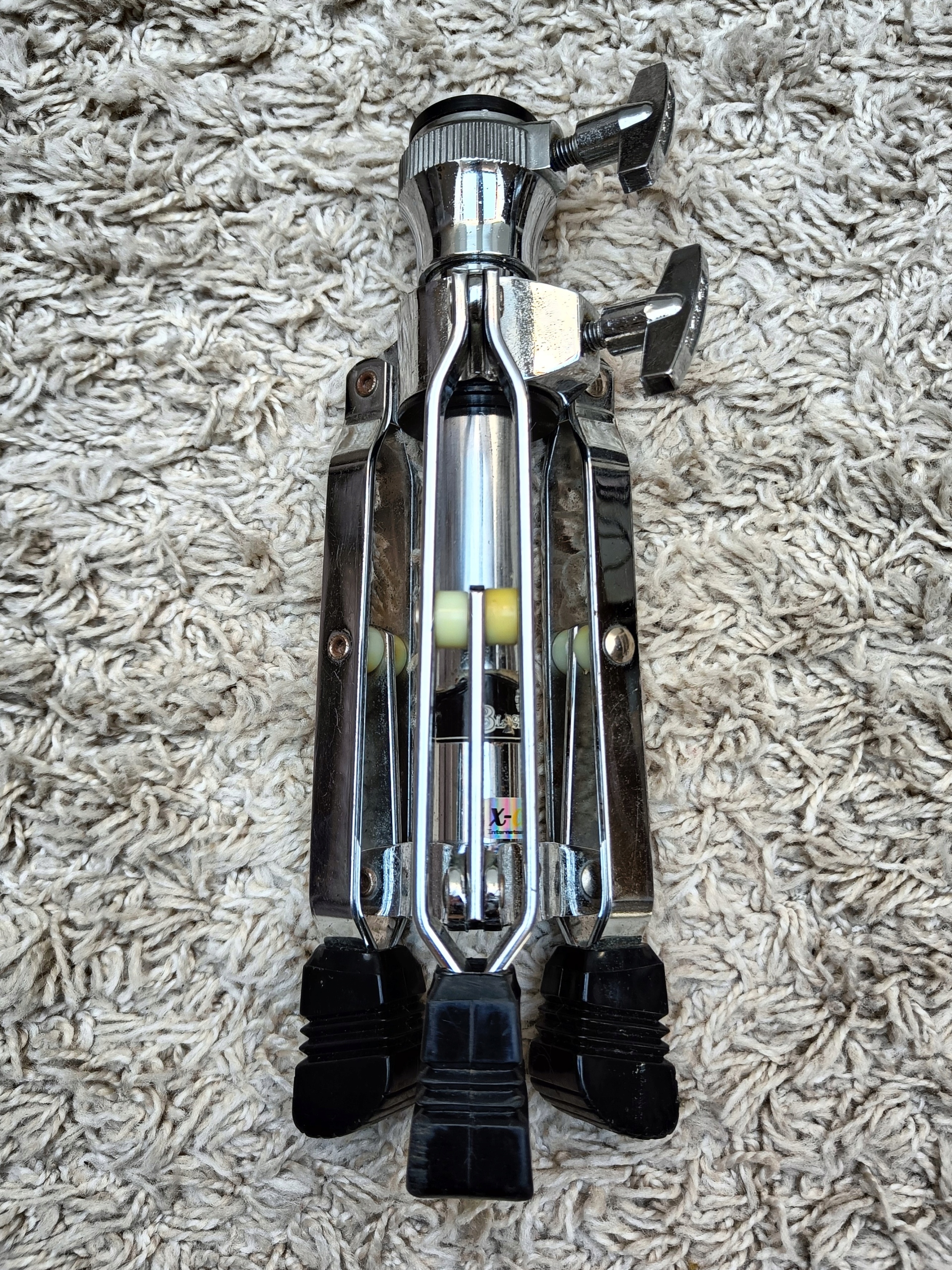 Statyw w stanie dobrym, w 100% sprawny technicznie, posiada sporo wgniotek na rurce pod koszem, które utrudniają chowanie się rurki w dolnej sekcji, więc trzeba użyć trochę więcej siły aby złożyć statyw.