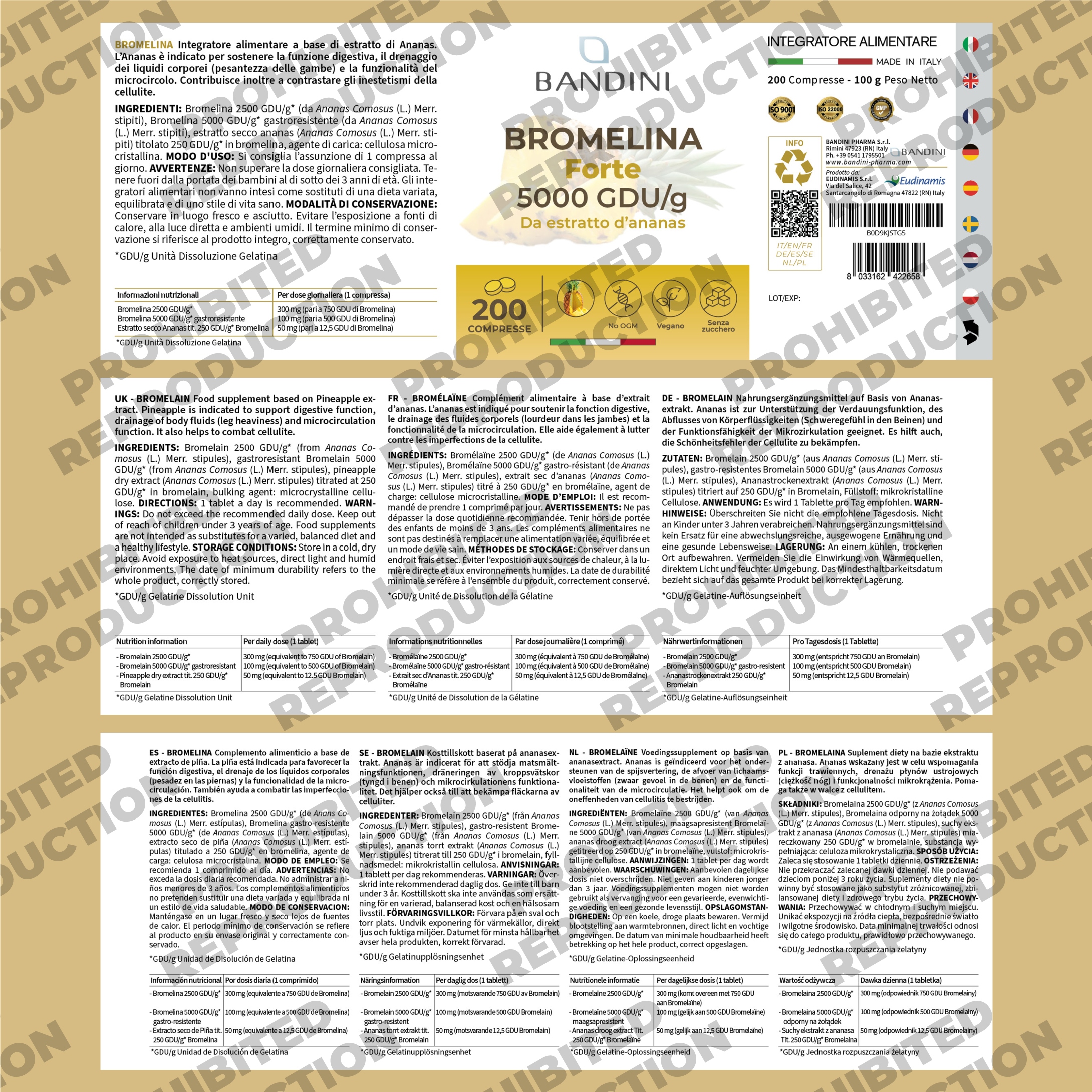 SPOSÓB UŻYCIA. Pozytywny efekt uzyskuje się przyjmując 1 tabletkę dziennie popijając wodą. Wystarczy 1 tabletka dziennie, aby uzyskać 10,000 F.I.P. bromelainy. Każde opakowanie zawiera 200 tabletek na zapas powyżej 6 miesięcy. Zalecamy przyjmowanie tabletki z dużą ilością wody na pełny żołądek, aby wspomóc funkcje trawienne lub na pusty żołądek, aby wspomóc drenaż. Kolor tabletek może różnić się od obrazu