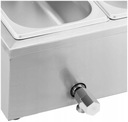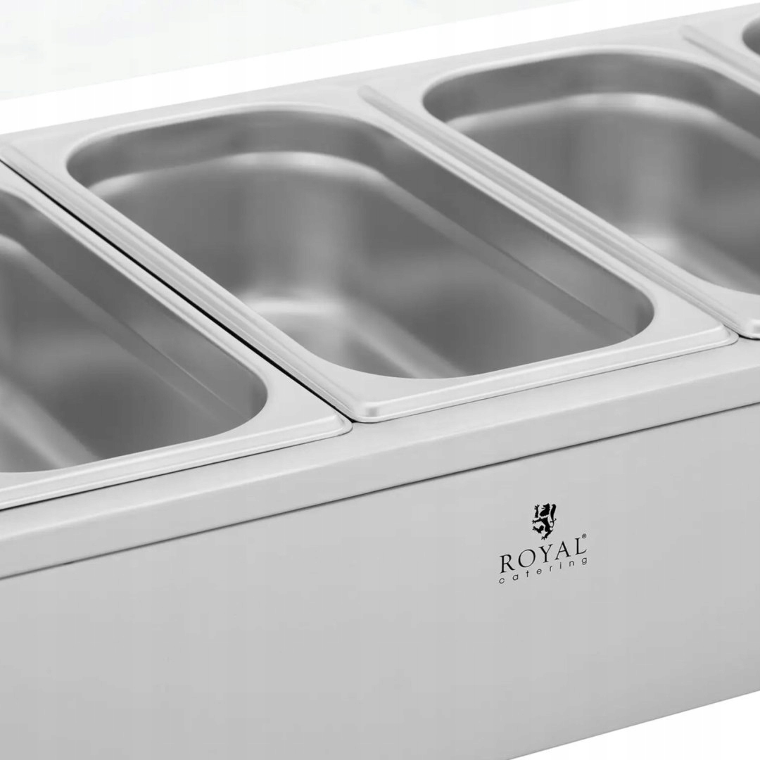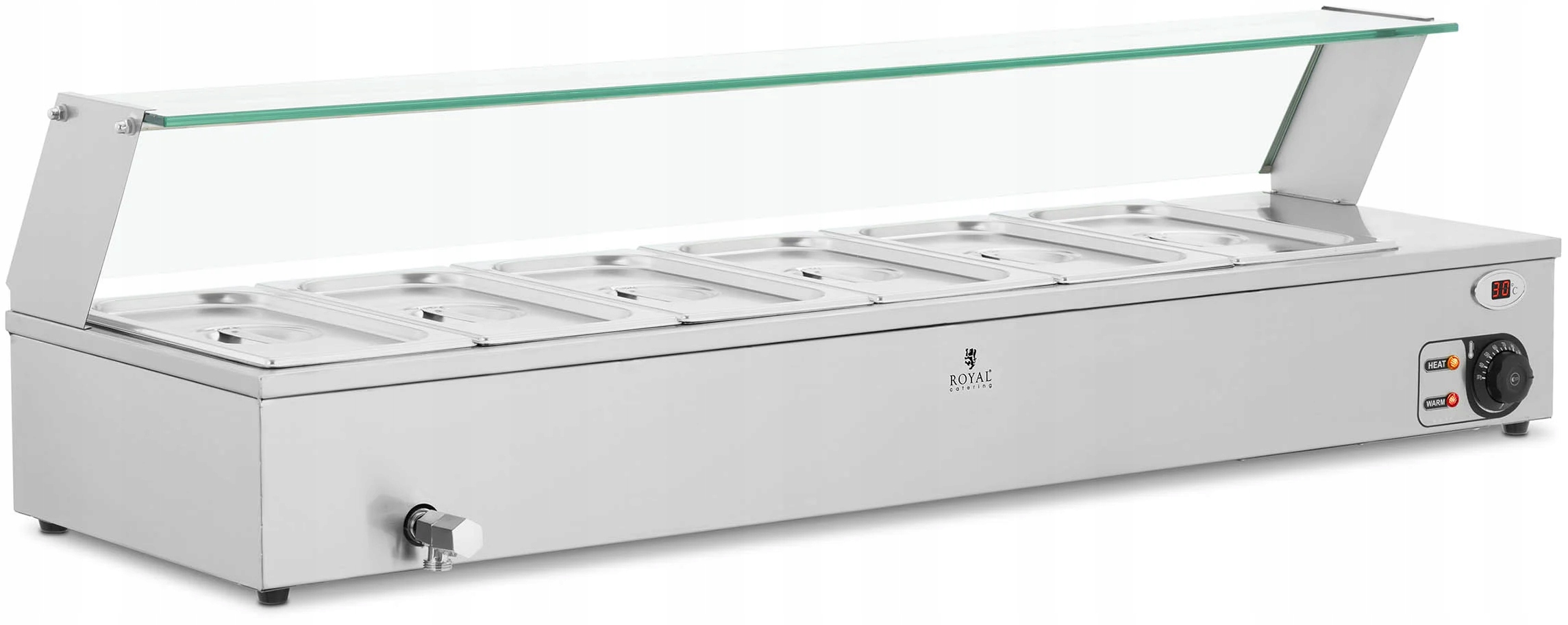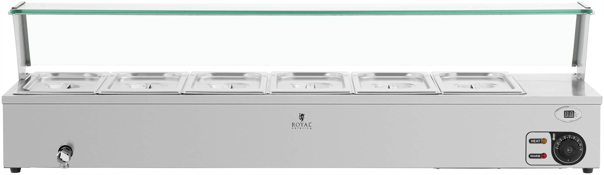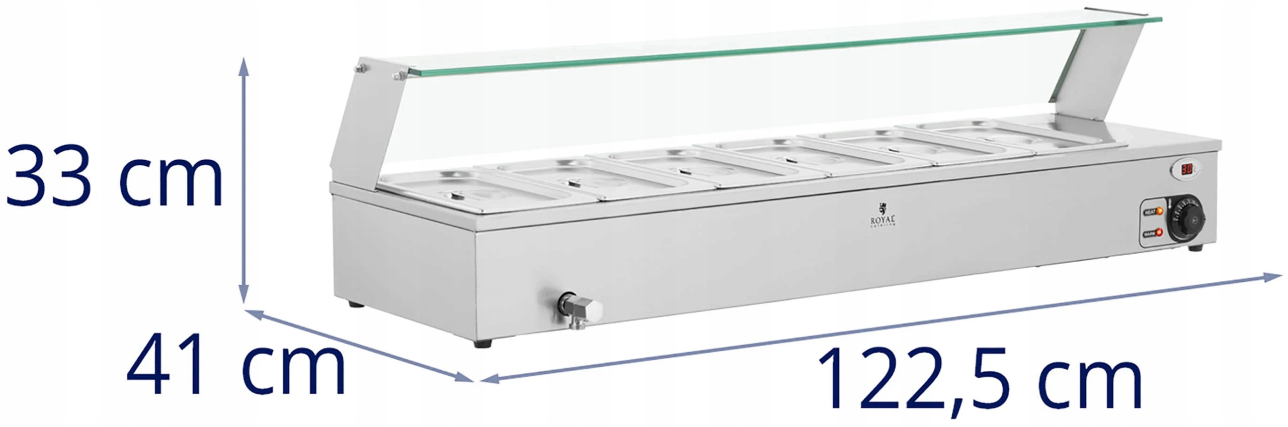 Bemar marki Royal Catering pozwala doskonale zaprezentować potrawy, które przez długi czas pozostają ciepłe. Sprawdzi się do użytku w restauracjach, hotelach, stołówkach, bufetach, barach z przekąskami, kawiarniach lub domach spokojnej starości i klinikach. 6 pojemników GN umożliwia przechowanie składników lub kilku różnych potraw, takie jak mięso, ryby, warzywa, ryż, ziemniaki i sos w żądanej temperaturze - bez ryzyka przypalenia. Duża moc 2100 W szybko podgrzewa kąpiel wodną do żądanej temperatury. Temperatura regulowana jest pokrętłem w zakresie 30-110°C. Bemar wyposażono w kurek spustowy ułatwiający użytkowanie. 6 pojemników GN 1/3 z pokrywkami oferuje łączną objętość 21 l. Pojemniki są całkowicie wyjmowane, można napełnić je żywnością bezpośrednio w strefie gotowania i umieścić w bemarze. Urządzenie posiada szklaną osłonęz bezpiecznego szkła. Montowana jest w kilku prostych krokach. Osłona chroni żywność i naczynia przed zabrudzeniami. Jednocześnie oferowane dania są dobrze widoczne dla klientów. Bemar wykonano ze stali nierdzewnej, która charakteryzuje się trwałością i odpornością na korozję oraz uderzenia. Jest neutralna dla zdrowia oraz łatwa w czyszczeniu, a zatem higieniczna.