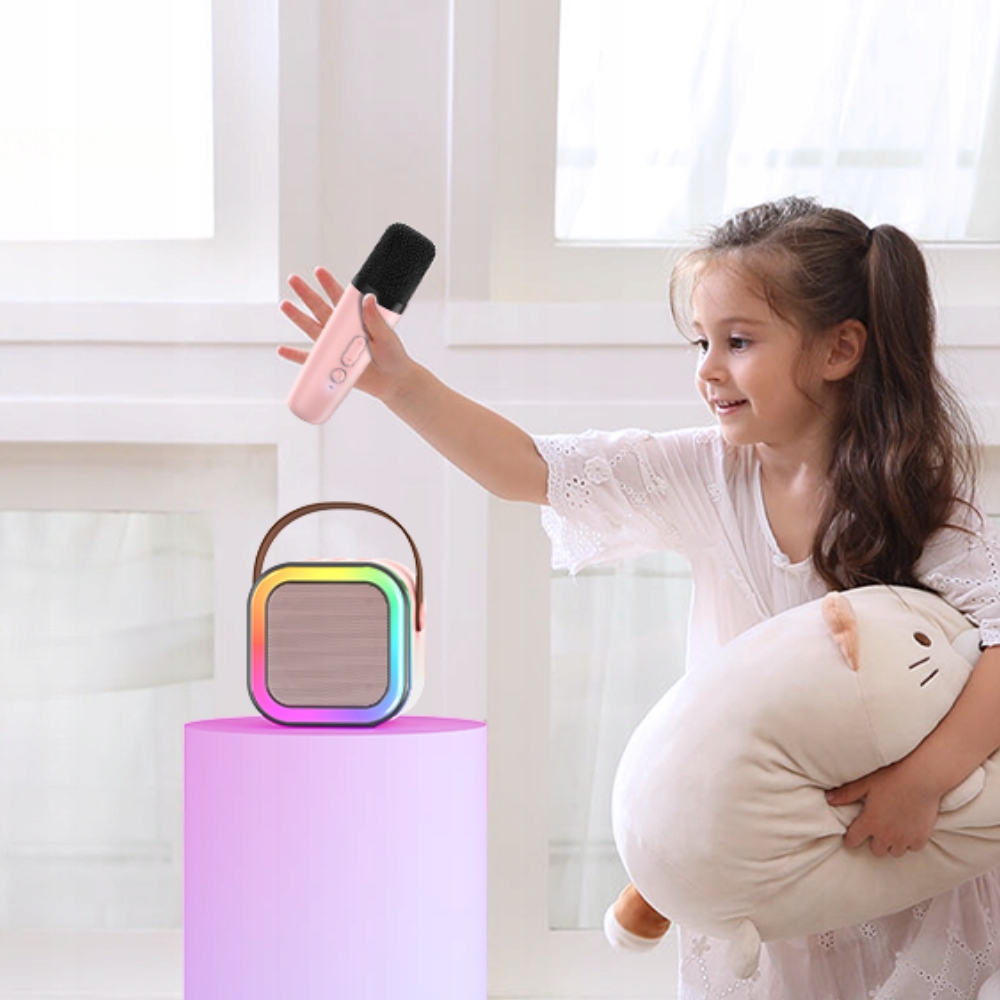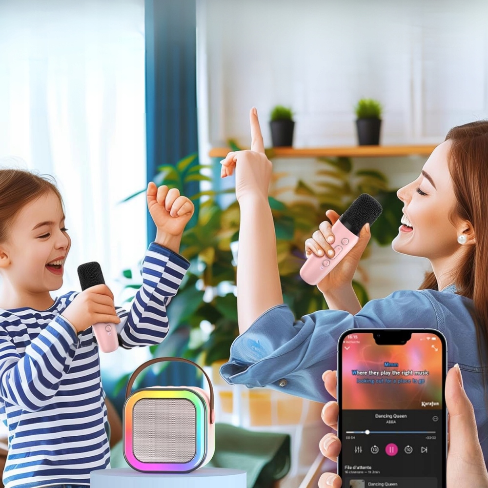 Dwa mikrofony i głośnik tworzą doskonały duet do wspólnego śpiewania i słuchania ulubionej muzyki.