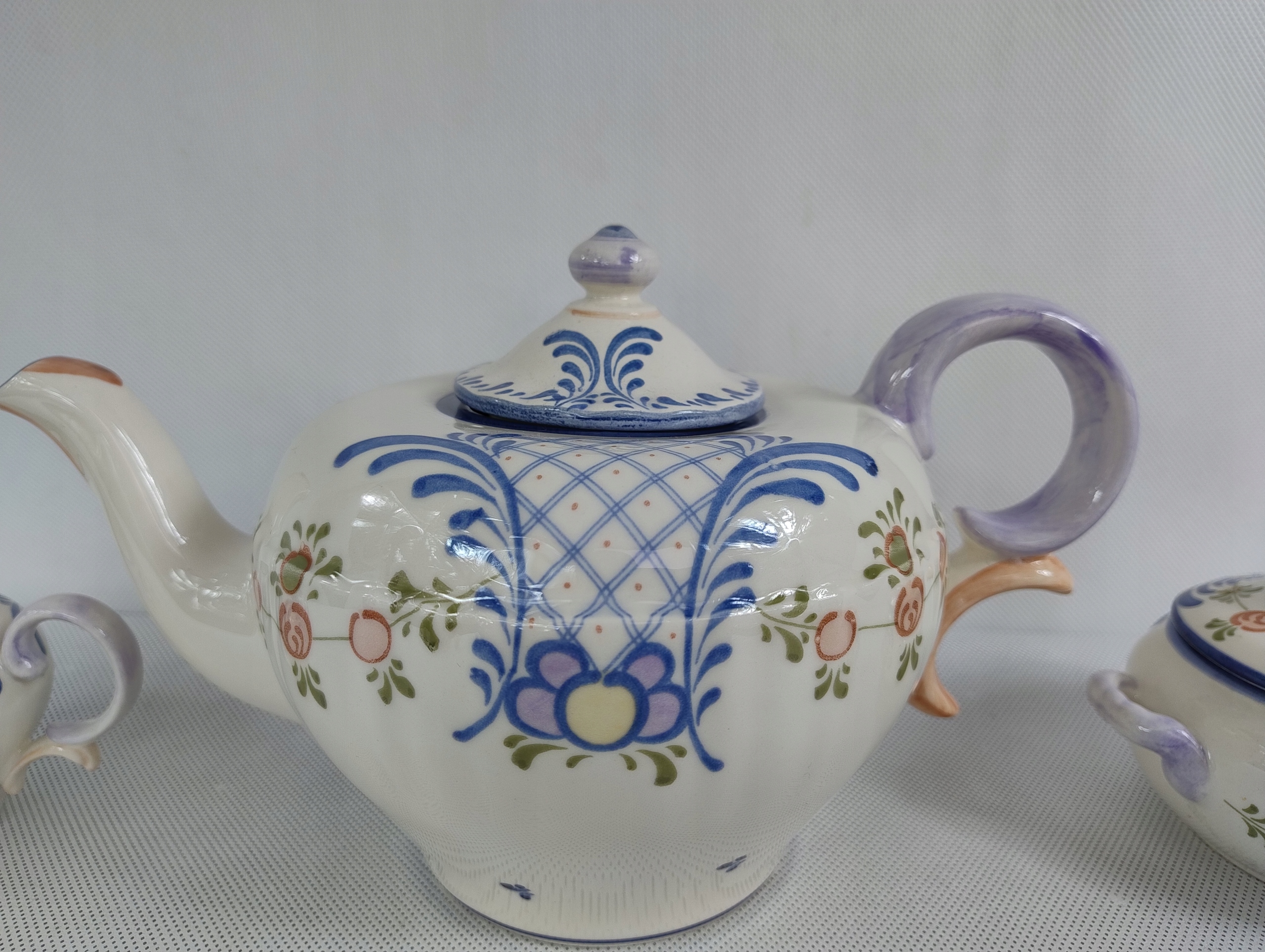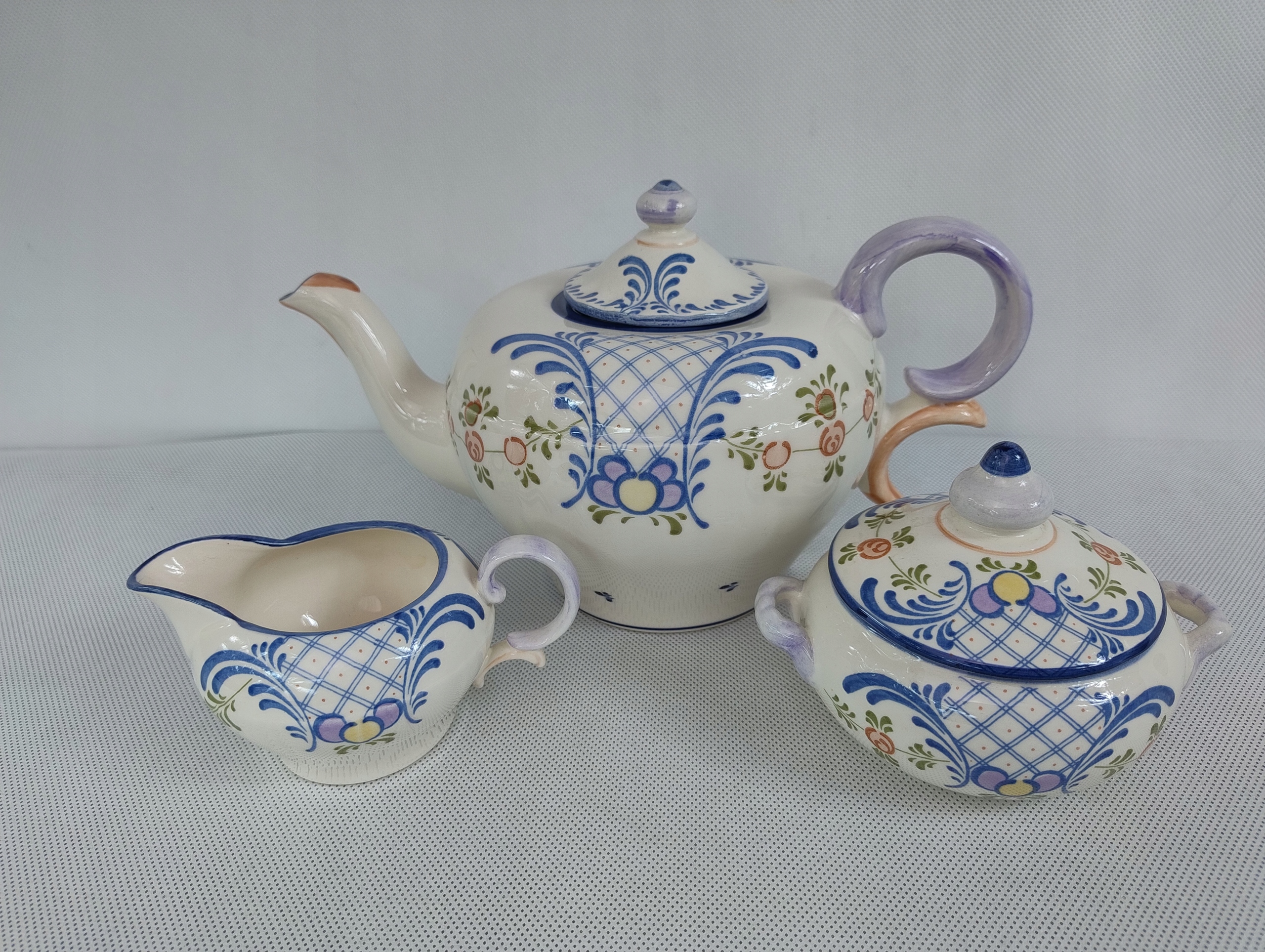 Zestaw charakteryzuje się jasnokremową podstawą ozdobioną pastelowymi akcentami, co nadaje mu elegancki i subtelny wygląd. Stan zachowania jest bardzo dobry, co sprawia, że jest idealny zarówno do codziennego użytku, jak i jako element kolekcjonerski.
