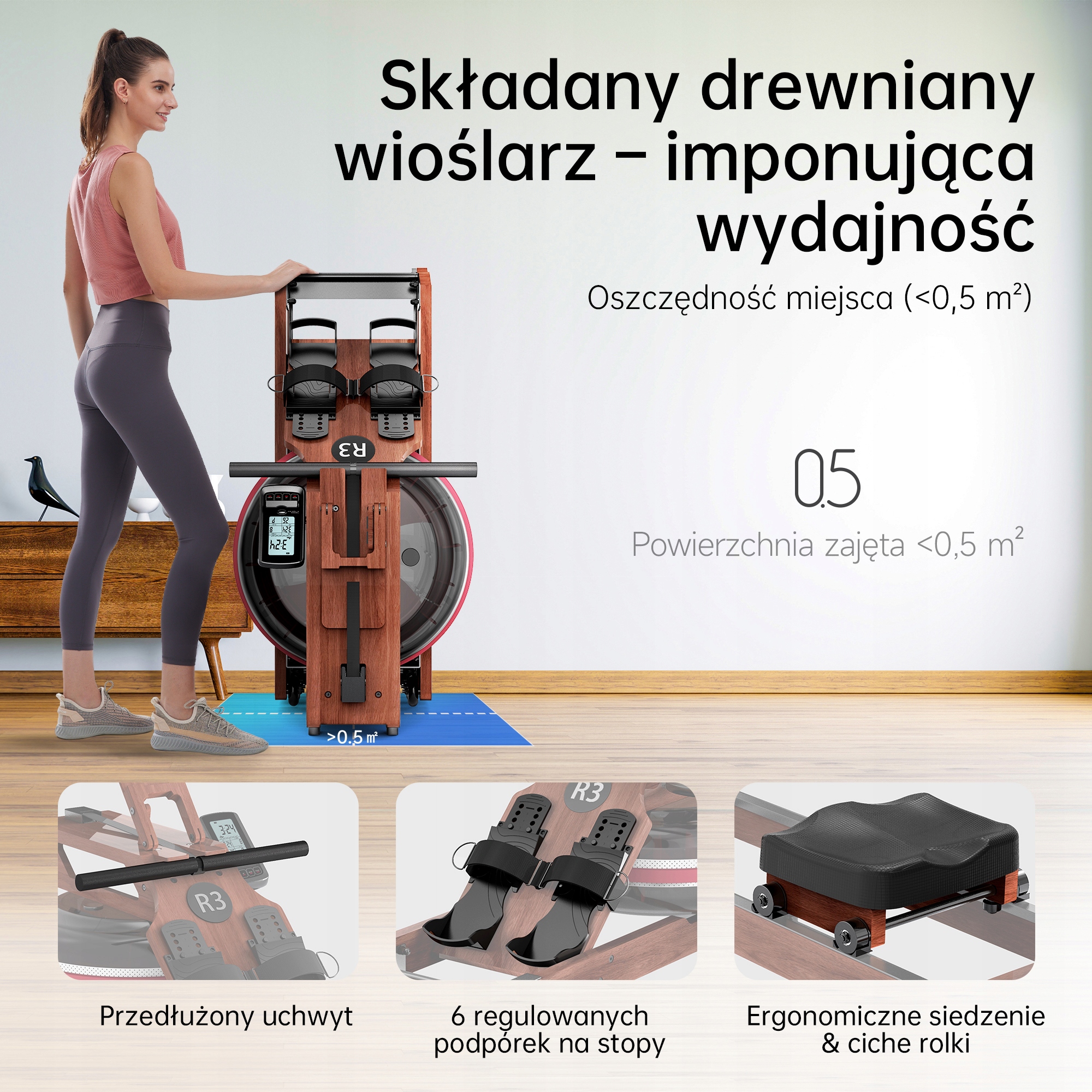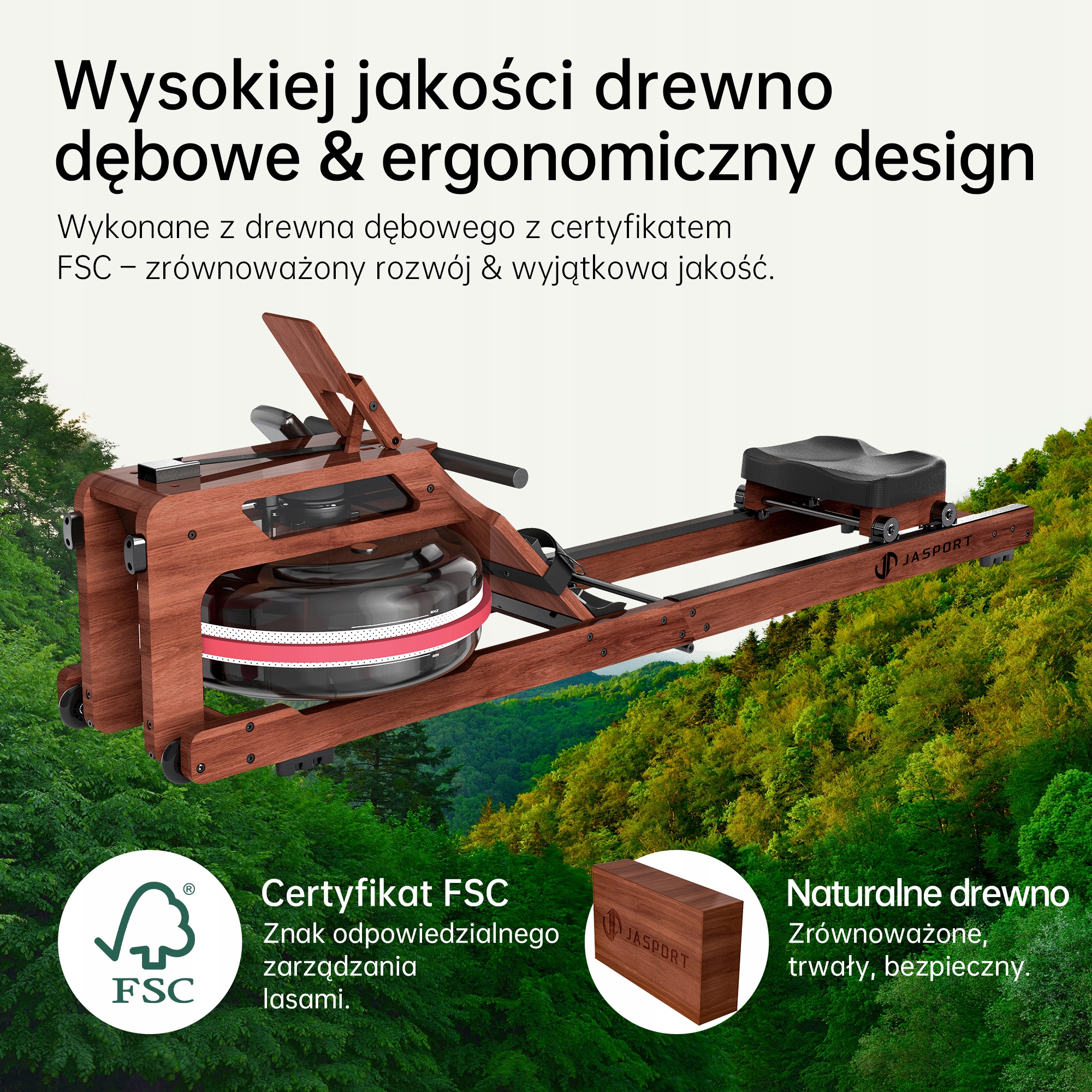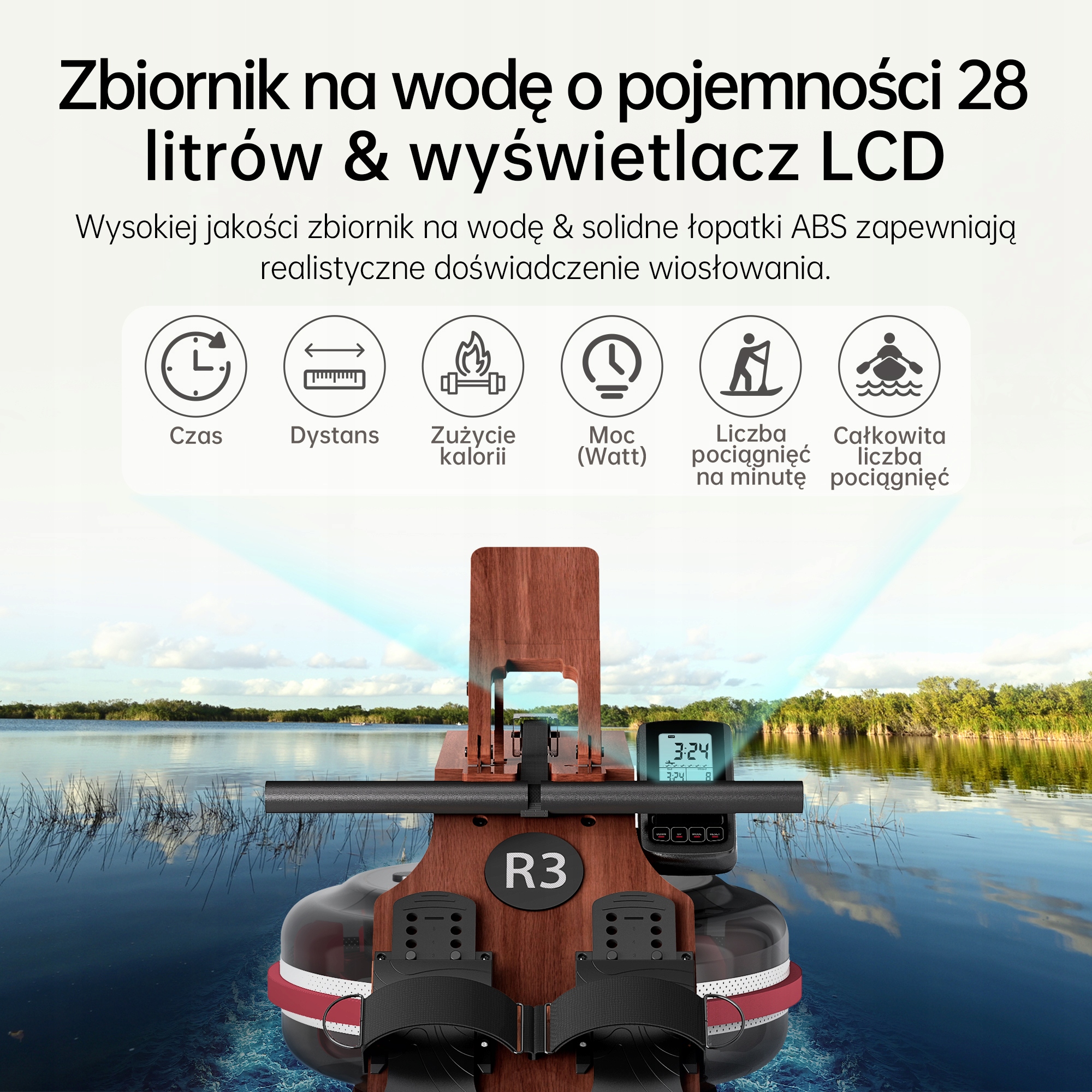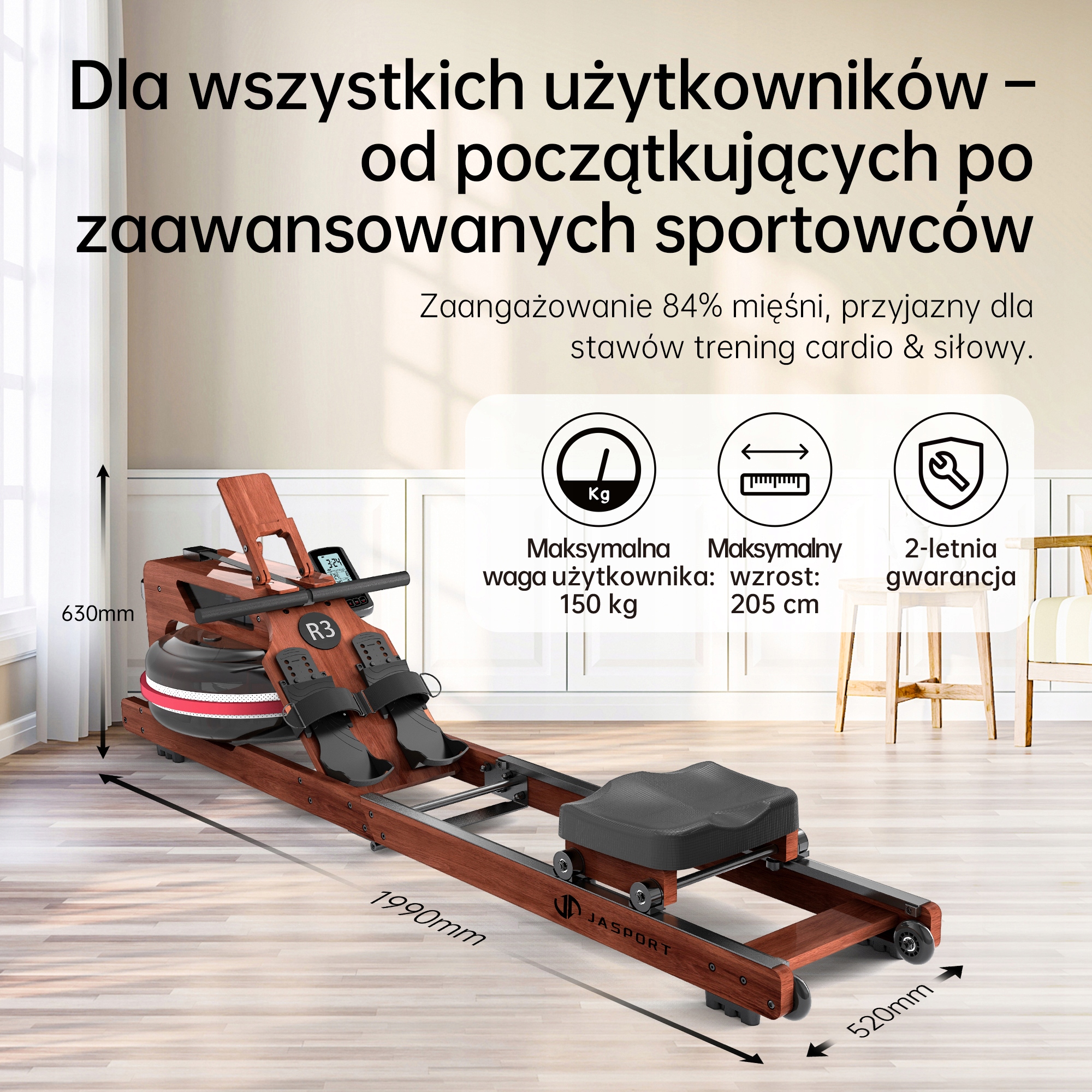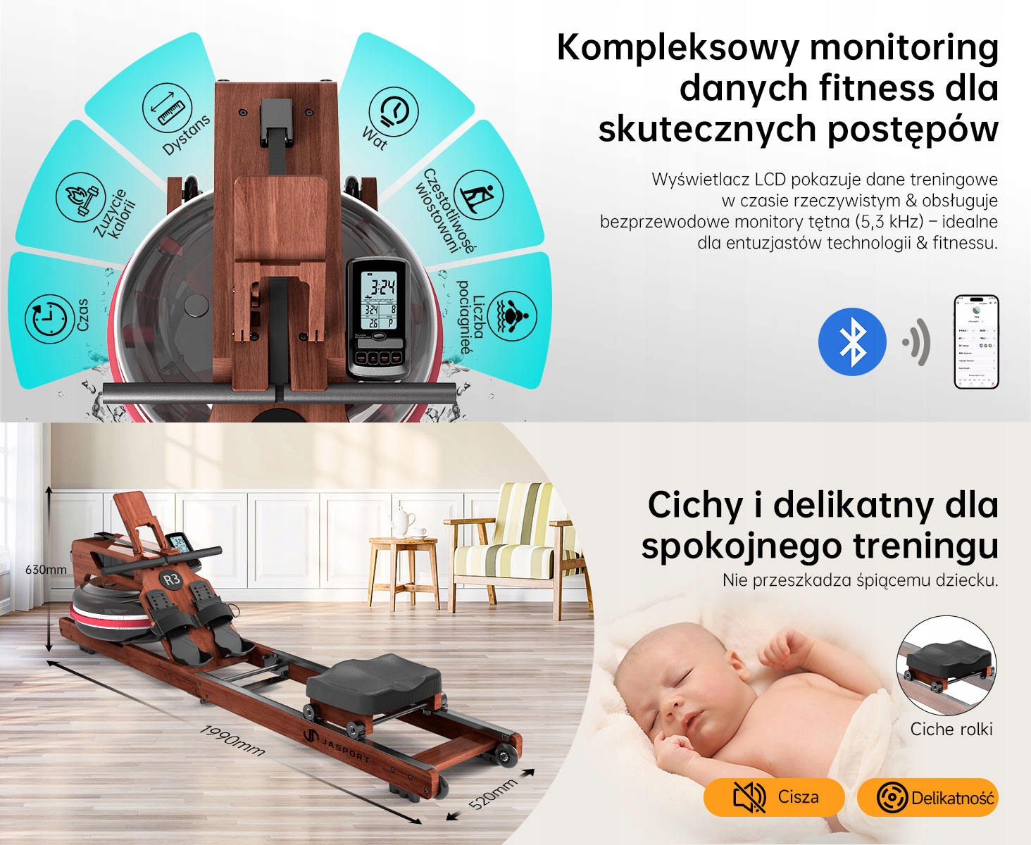 Wyświetlacz LCD z kontrolą danych fitness JASPORT R3 jest dostępny na ekranie LCD, który w czasie jest ważny, dane treningowe, takie jak czas, dystans, czas na 500 m, spalone kalorie, moc, ilość wioseł i wrażenie. Funkcje te umożliwiają kontrolę postępów treningowych i umożliwiają skuteczne osiąganie celów fitness.