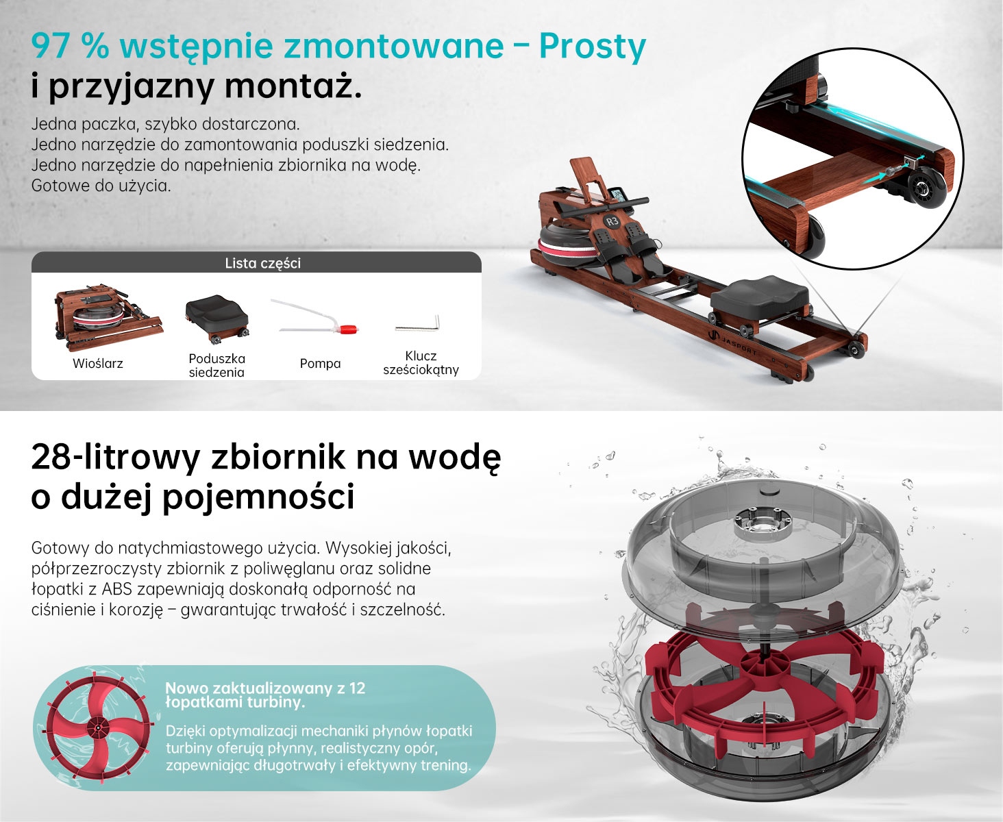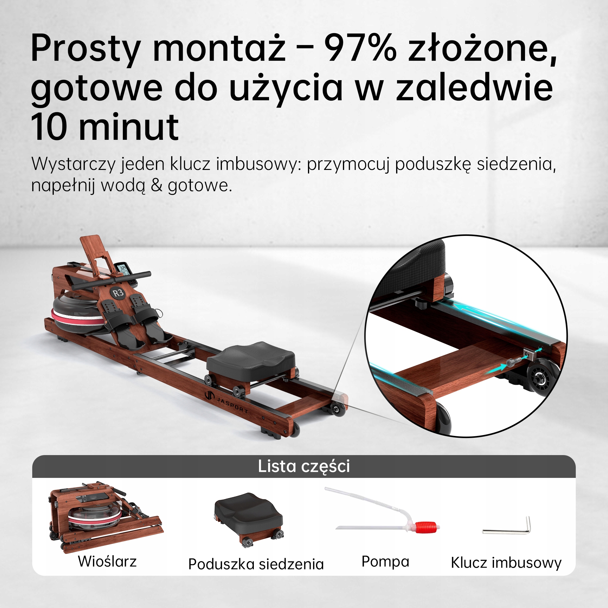 97% odłączone – wystarczy rozłożyć i podłączyć JASPORT R3 dostarczany jest w 97% zmontowany. Proste rozmieszczenie urządzenia, udostępnienie i włączenie udostępniania wody, aby od razu uruchomić szkolenie – bez użycia urządzeń końcowych. Możliwość podłączenia umożliwiającego podłączenie programu fitness.