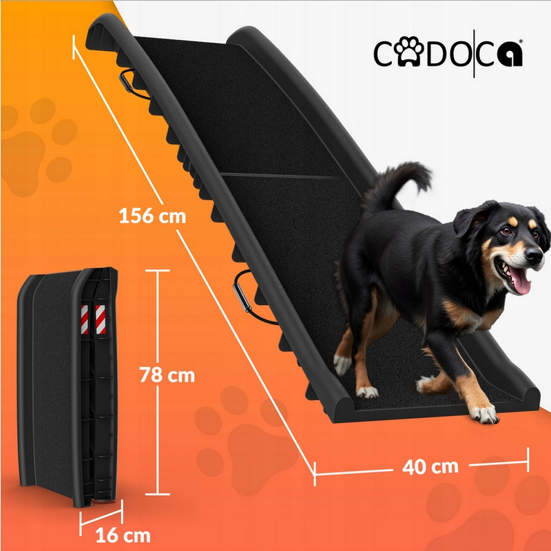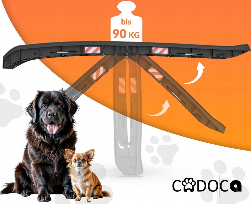 Składana rampa pomaga twojemu czworonożnemu przyjacielowi być mobilnym i dotrzeć do wyższych miejsc, takich jak sofa, samochód. Szorstka, antypoślizgowa powierzchnia zapewnia bezpieczne trzymanie dla małych i dużych łap - szczeniaka, starszego psa itd.