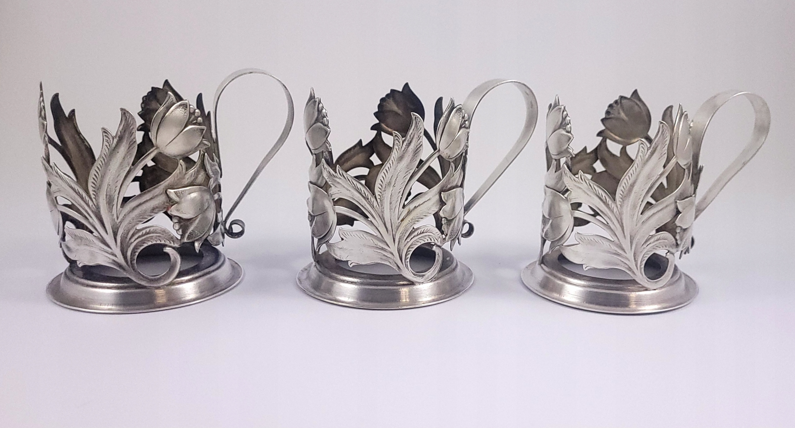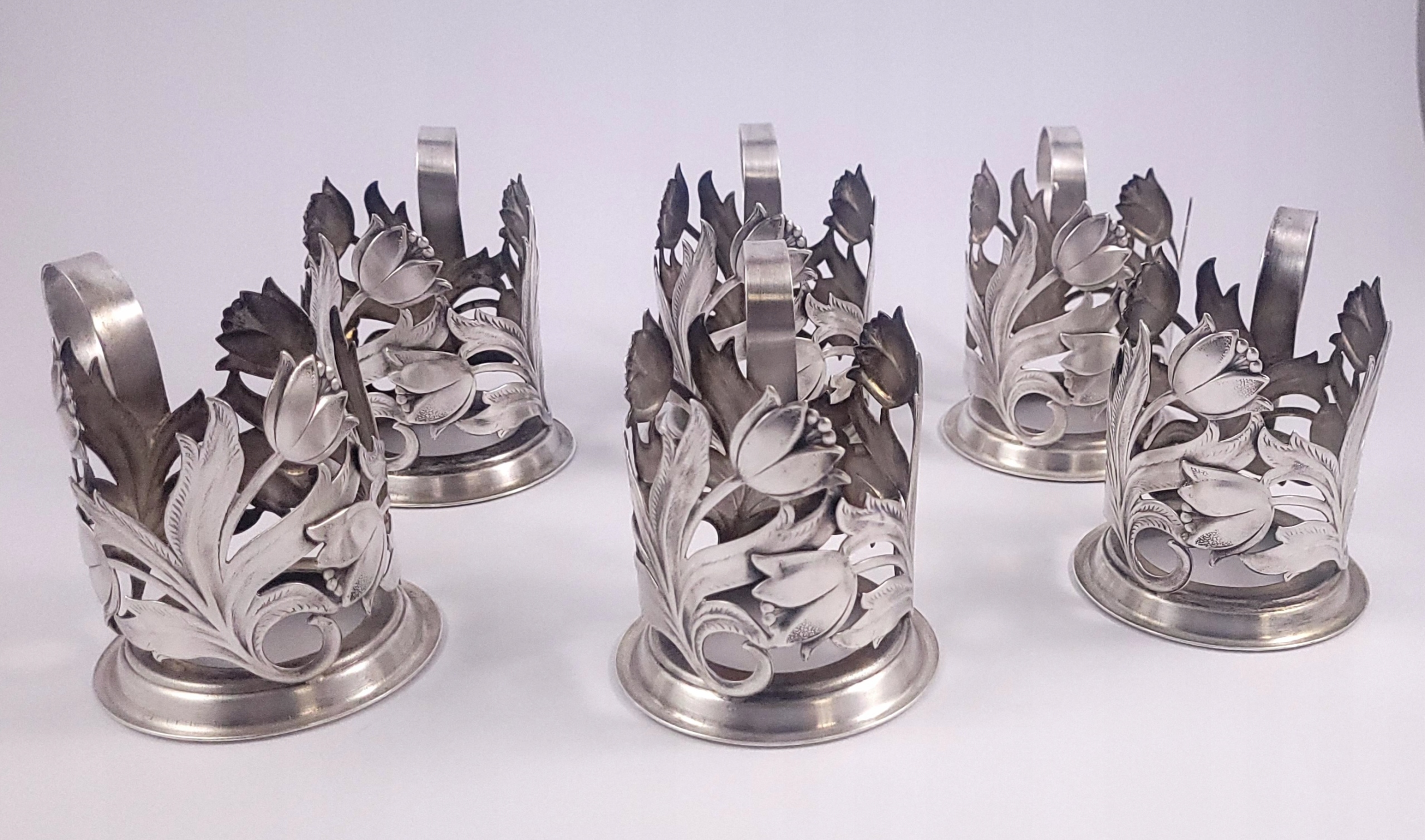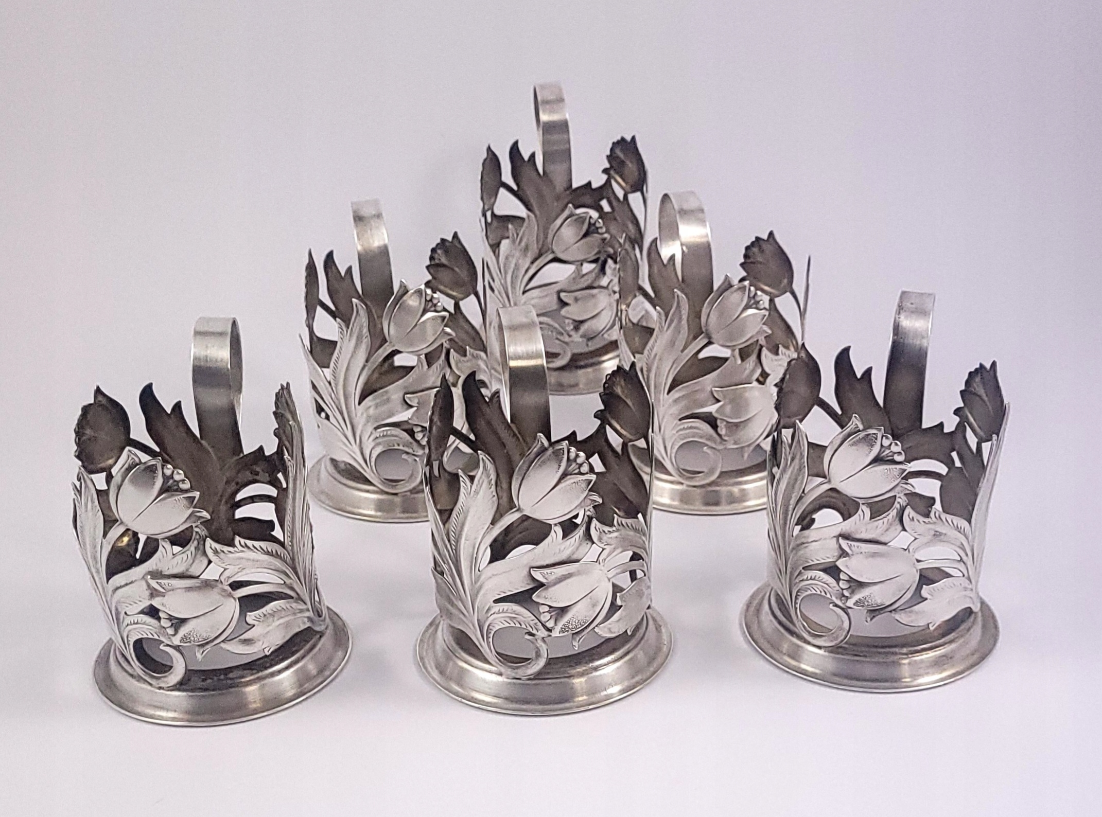 Komplet sześciu platerowanych uchwytów do szklanek - tzw podstakanników.