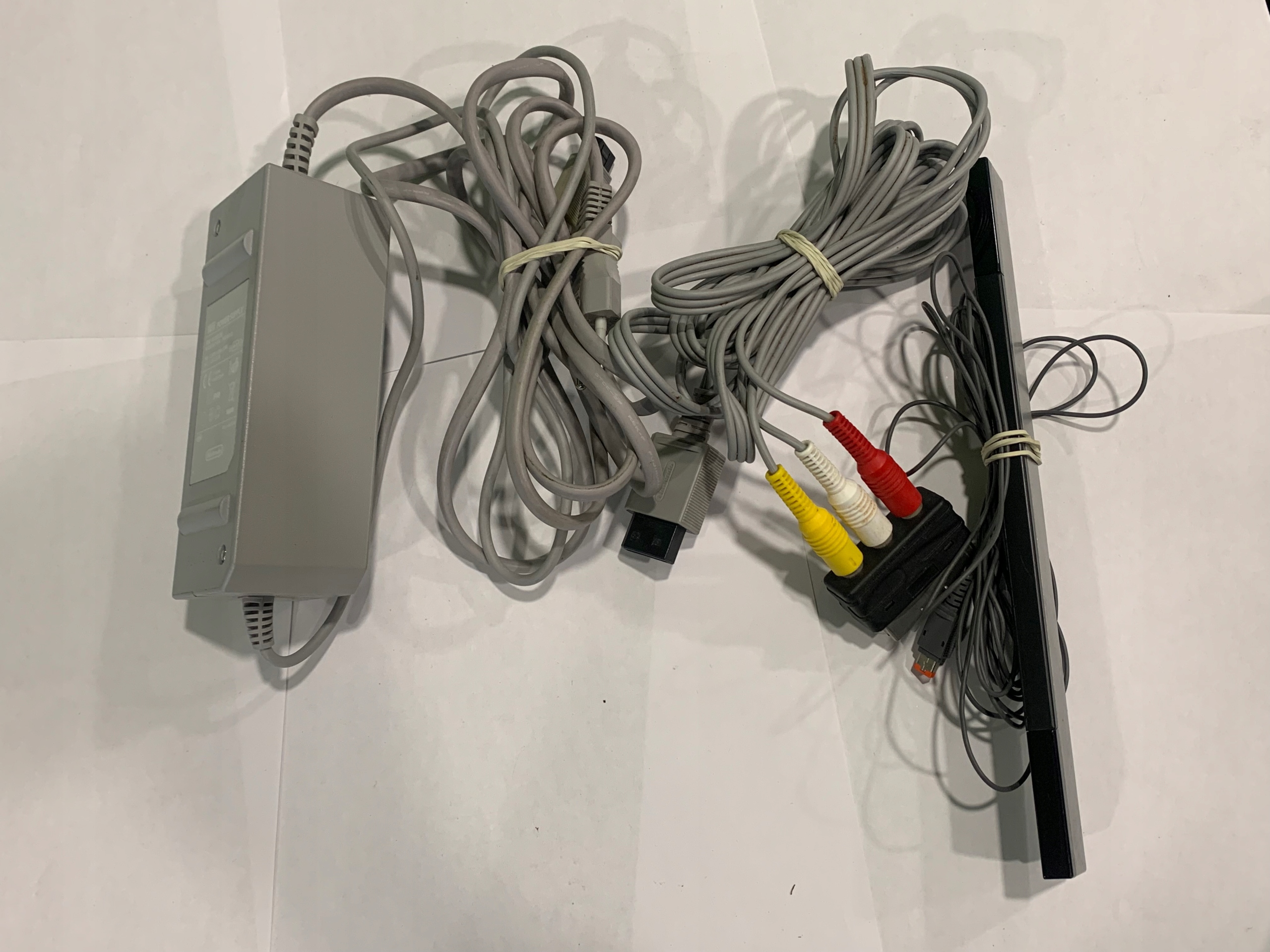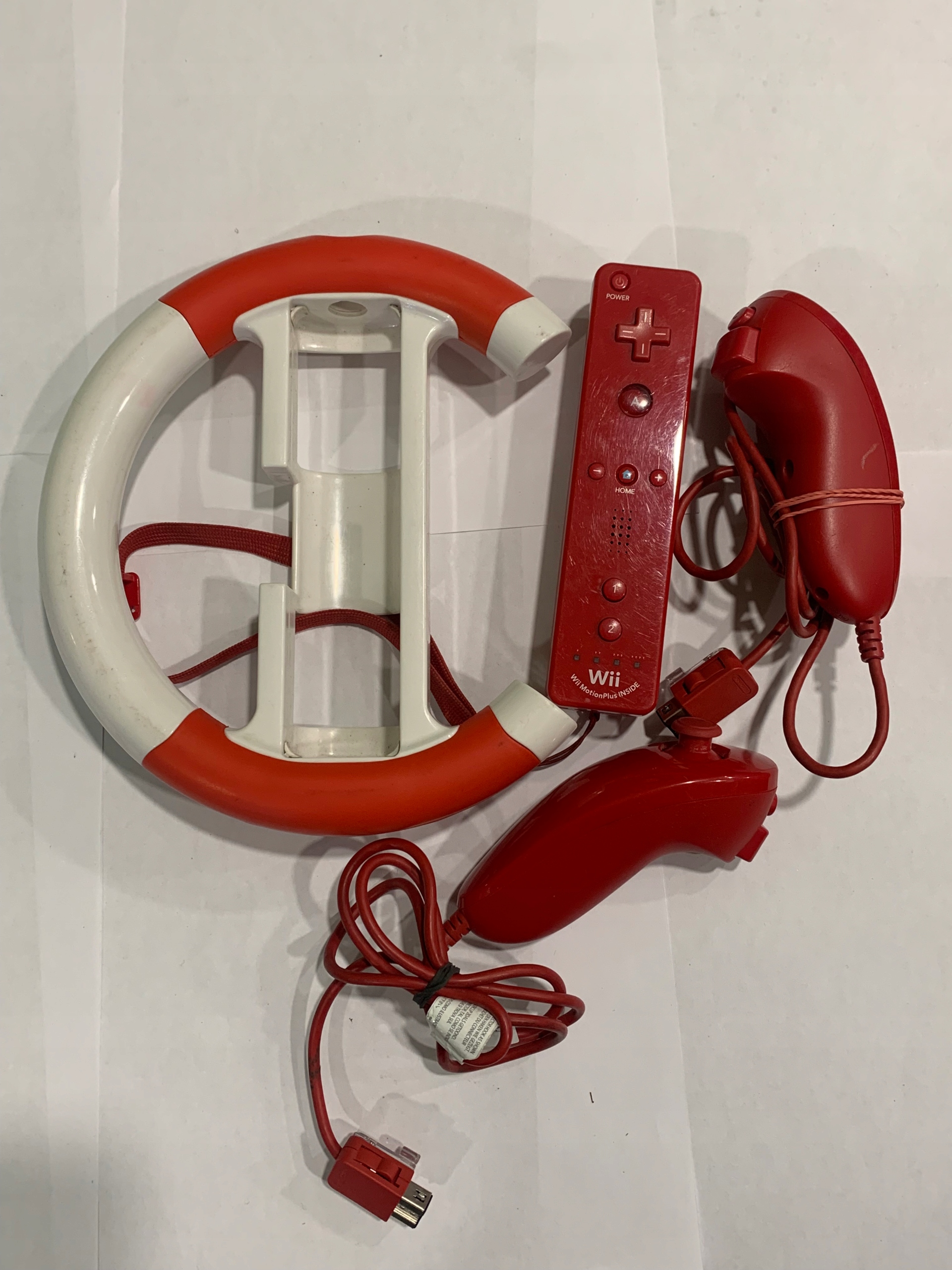 W sklad aukcji wchodzi konsola, zasilacz, kabel AV, sensor bar, 1 kontroler, kierownica, 2 nunchucki.