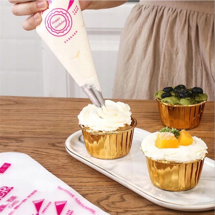 Rękawy można używać z końcówkami do dekoracji (tylkami). Pozwolą na tworzenie najróżniejszych ozdób na twoich tortach, ciastach lub deserach.