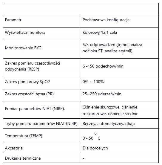 Przyłóżkowy monitor pacjenta do monitorowania i kontroli głównych parametrów fizjologicznych dorosłych pacjentów i dzieci: EKG (częstość akcji serca, analiza odcinka ST, analiza arytmii). Częstość oddechów (RESP). SpO2. Tętno. NIAT. Temperatura.