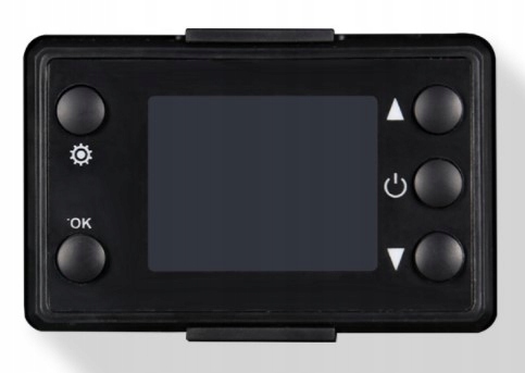 Wyświetlający parametry i tryb pracy. Pilot umożliwia zdalne sterowanie nagrzewnicą. Dzięki przesuwnemu elementowi przyciski są zabezpieczone przed przypadkowym naciśnięciem.