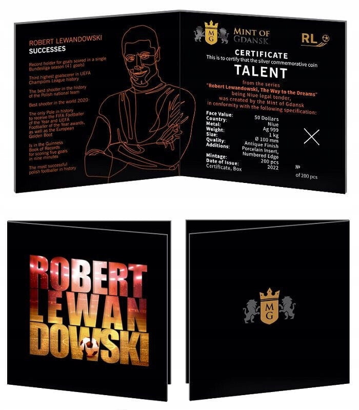 Moneta ta została wybita aż z 1 kilograma srebra próby 999 w limitowanym nakładzie wynoszącym 200 sztuk. Czynnik ten sprawia, że jest to doskonała moneta kolekcjonerska. Rewers monety przedstawia Roberta Lewandowskiego, którego talent do gry w piłkę nożną ujawnił się już w dzieciństwie i zaprowadził go do najlepszych klubów piłkarskich świata. Monetę zdobi wstawka 3D imitująca piłkę. Z kolei na awersie, oprócz emitenta i wartości nominalnej, znajduje się boisko piłkarskie. Moneta zapakowana jest w eleganckie drewniane pudełko wraz z certyfikatem poświadczającym jej autentyczność.