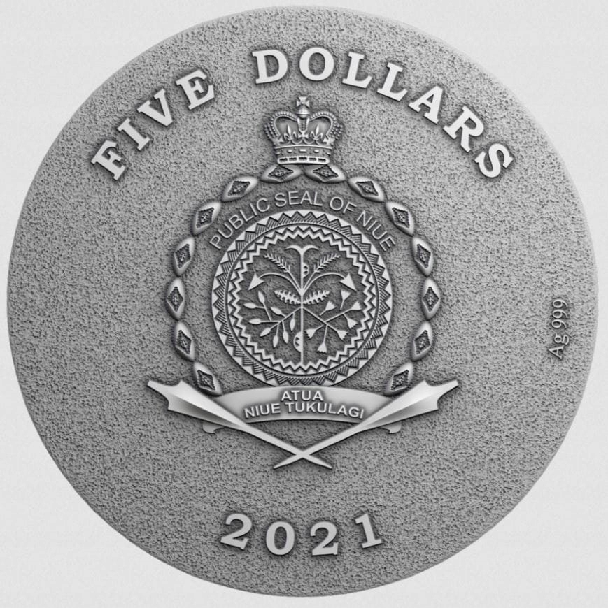 Rewers monety przedstawia pirata - przebiegłego porywacza i poszukiwacza skarbów. Szuka on zdobytego przez siebie azteckiego skarbu: bogactwa złotych wyrobów, monet i klejnotów. Obramowanie zostało stworzone z motywów znanych z kalendarza azteckiego. Z kolei na awersie znajduje się herb wyspy Niue.