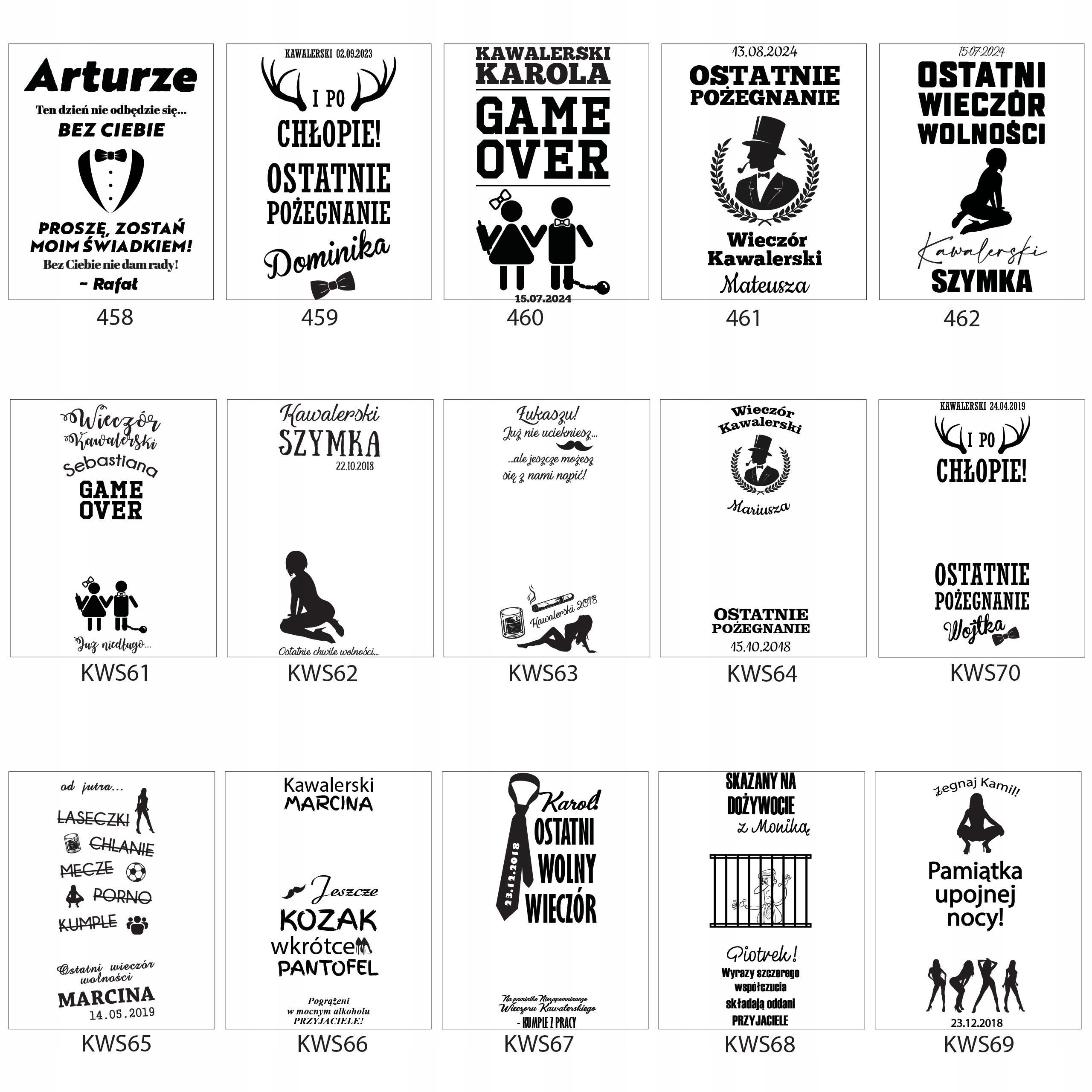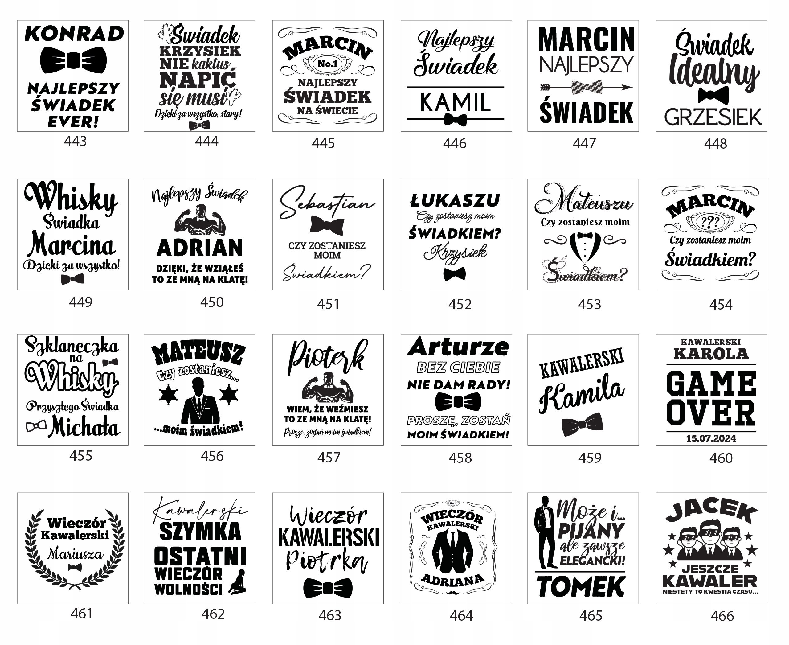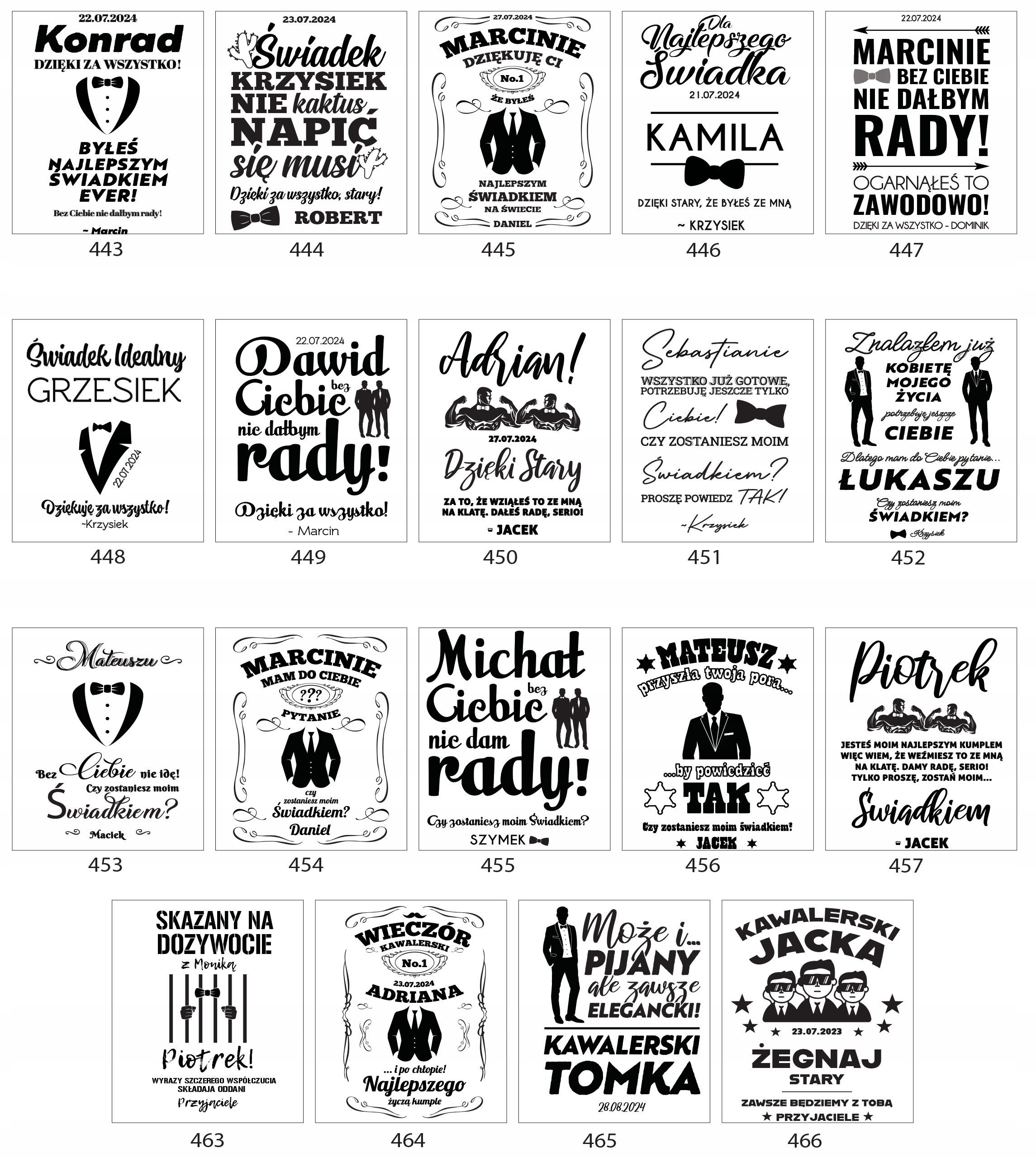 Podeślij informacje takie jak: numer wzoru znajdujący się przy wybranym przez Ciebie projekcie skrzynki oraz szklanki a także informacje potrzebne do spersonalizowania danego wzoru (imię świadka, imię pana młodego, datę ślubu).