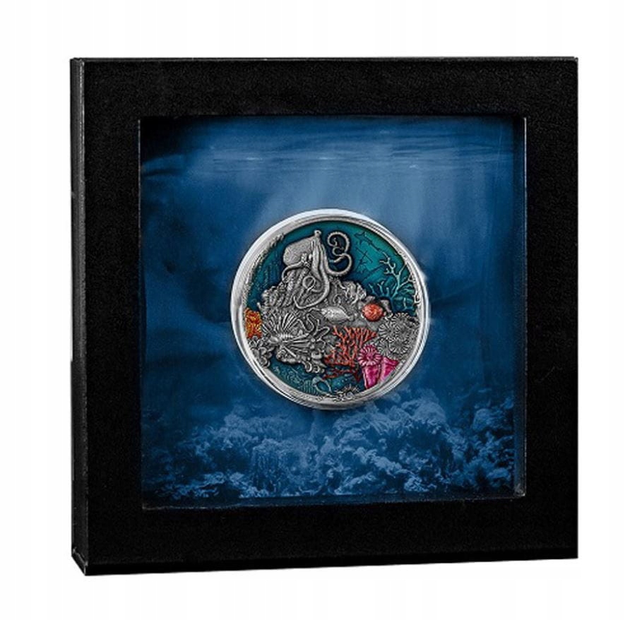 Wysoki relief ukazuje morską faunę w najdrobniejszych szczegółach. Dzięki dodatkowi w postaci żywicy, podwodna perspektywa nabiera głębi, a nasycone barwy sprawiają, że podwodne życie wygląda niezwykle realistycznie. Moneta dostarczana jest w tematycznym pudełku wraz z certyfikatem autentyczności.