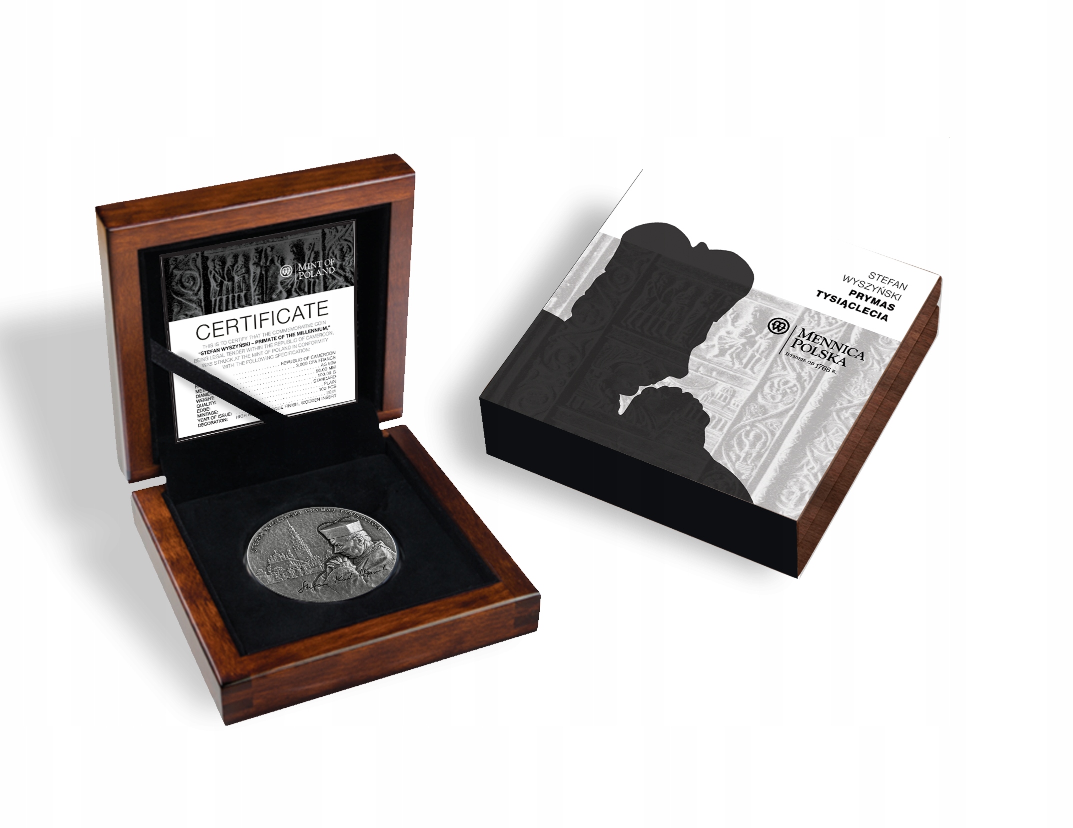 Wyjątkowa moneta, zaprojektowana ku pamięci kard. Stefana Wyszyńskiego (1901-1981). Ta piękna srebrna pamiątka została stworzona, by uczcić beatyfikację Prymasa Tysiąclecia w 2021 roku. Moneta wykonana ze 100 gramów czystego srebra to przykład najwyższego kunsztu sztuki menniczej.