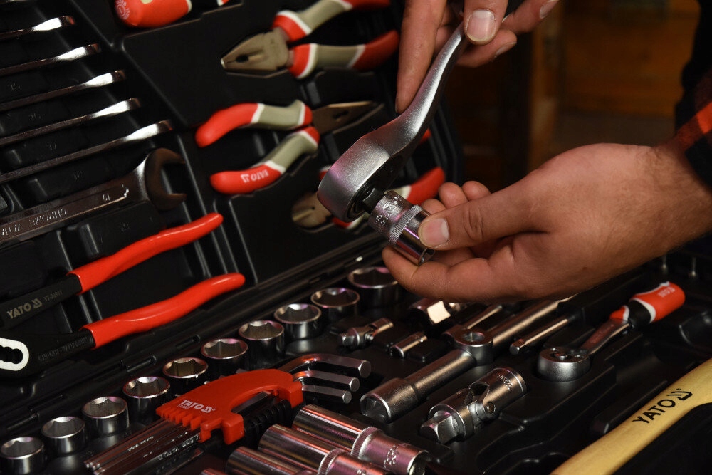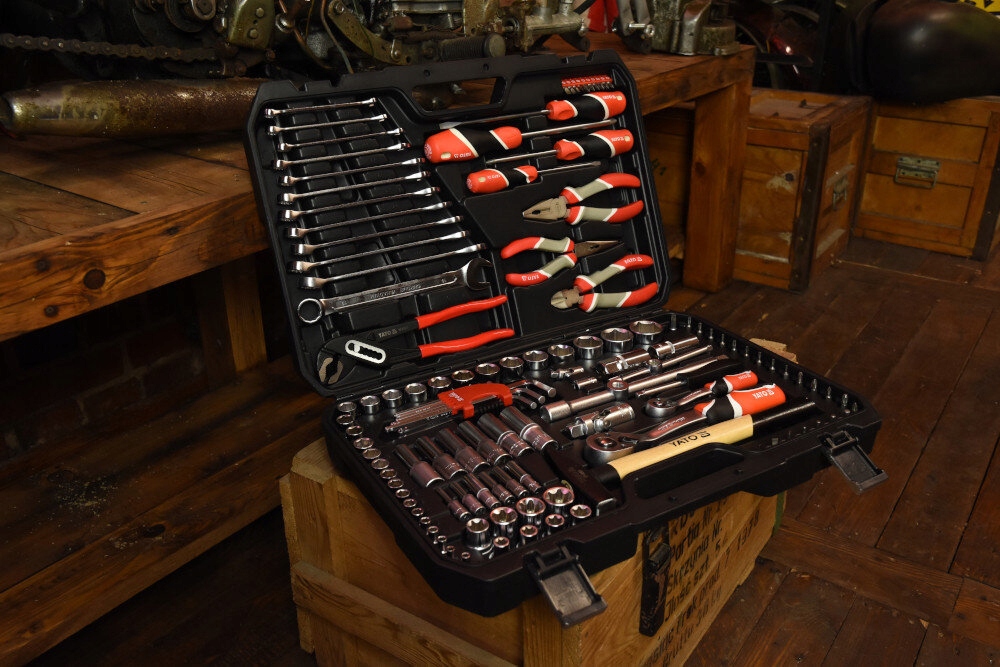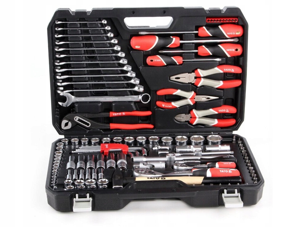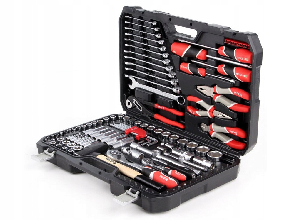 W zestawie narzędzi YATO YT-38901 znajdują się: nasadki, przedłużki, przeguby Cardana, nasadki do świec, grzechotka 1/2 cala i 1/4 cala, pokrętło do nasadek, redukcja, bity, bity na nasadzie, klucze płasko-oczkowe, wkrętaki, szczypce uniwersalne, szczypce tnące boczne, szczypce wydłużone proste, szczypce nastawne, młotek ślusarski, klucze sześciokątne, walizka oraz niezbędna dokumentacja.