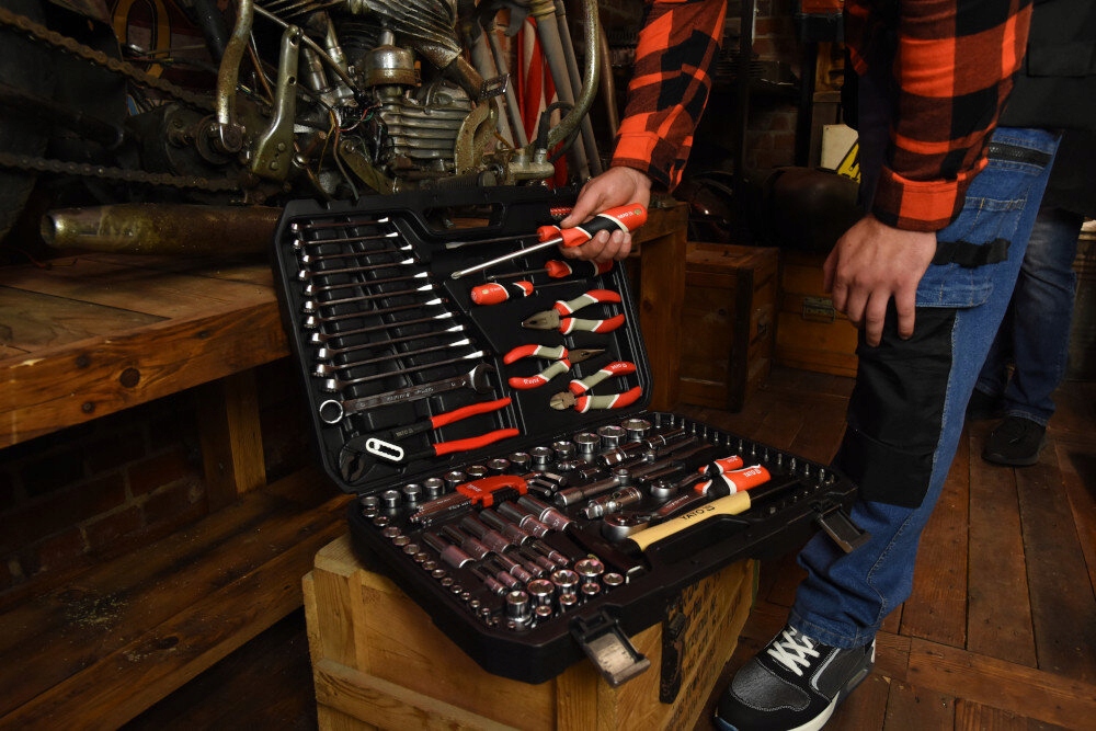 W zestawie znajdują się również nasadki w rozmiarach od 4 mm do 32 mm oraz klucze oczkowe i płaskie od 8 mm do 19 mm, które umożliwiają pracę z szerokim zakresem śrub i nakrętek. Dzięki temu możesz wykonywać różnorodne zadania bez potrzeby posiadania dodatkowych narzędzi. Kute na zimno szczypce gwarantują wysoką precyzję i trwałość, idealne do cięcia, gięcia i chwytania różnych materiałów. To narzędzie, na którym zawsze możesz polegać.