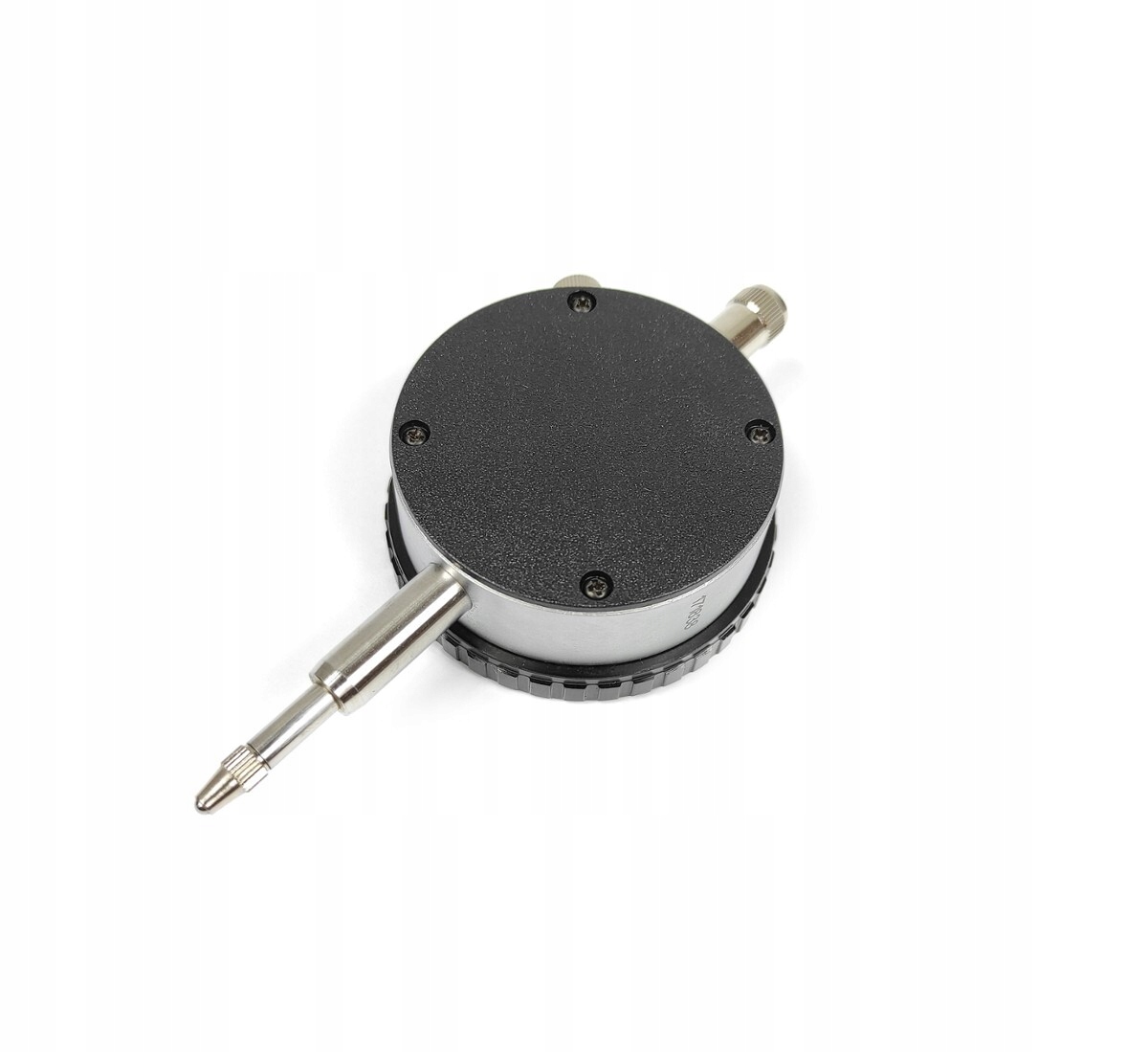 Zegarowy czujnik pomiarowy o zakresie pomiaru 0-3 mm oraz podziałce 0,01 mm.