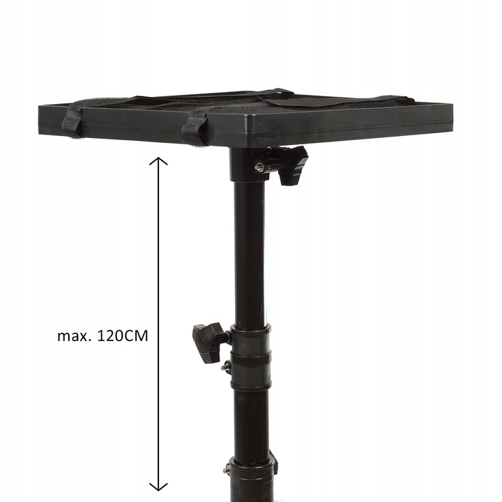 Stojak został zaprojektowany z myślą o bezpieczeństwie - obramowana tacka chroni projektor przed zsunięciem się, a dodatkowe pasy na rzepy zapewniają jego stabilne mocowanie. Wykonany z wytrzymałej stali malowanej proszkowo w kolorze czarnym, jest nie tylko elegancki, ale także trwały, co gwarantuje długotrwałe użytkowanie.
