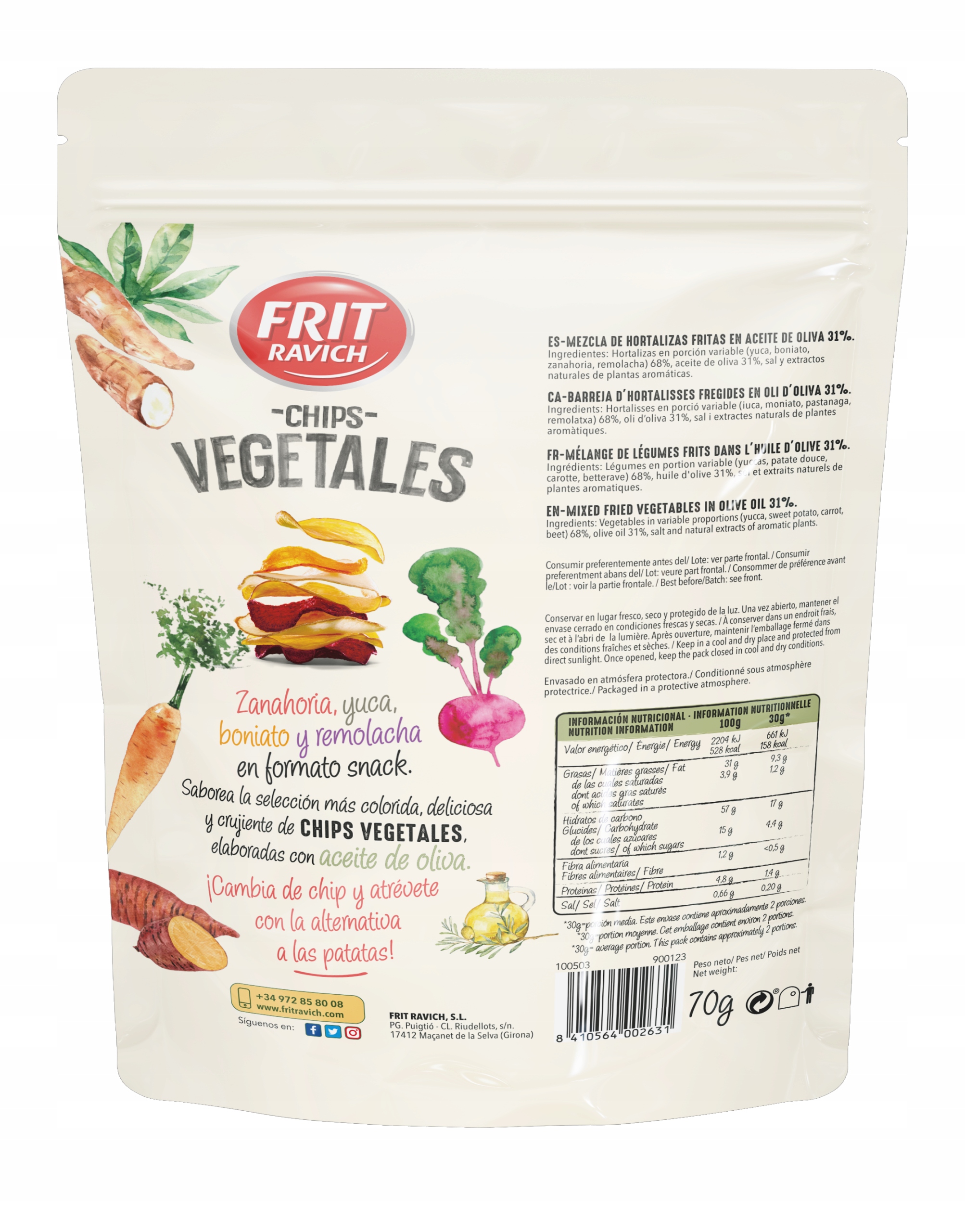 Chips warzywny Frit Ravich to zdrowa alternatywa dla tradycyjnych chipsów. Chrupiące plastry kolorowych warzyw z dodatkiem oliwy z oliwiek. Doskonałe źródło błonnika i witamin. Pomocne w kontrolowaniu poziomu cukru we krwi oraz poprawa trawienia.