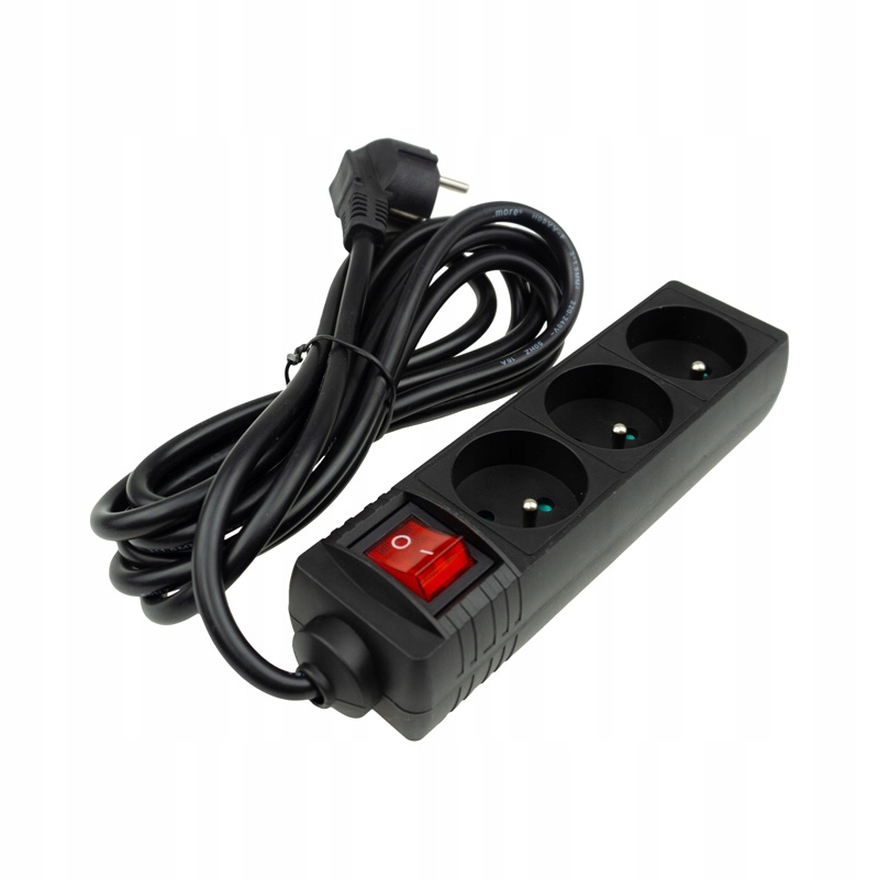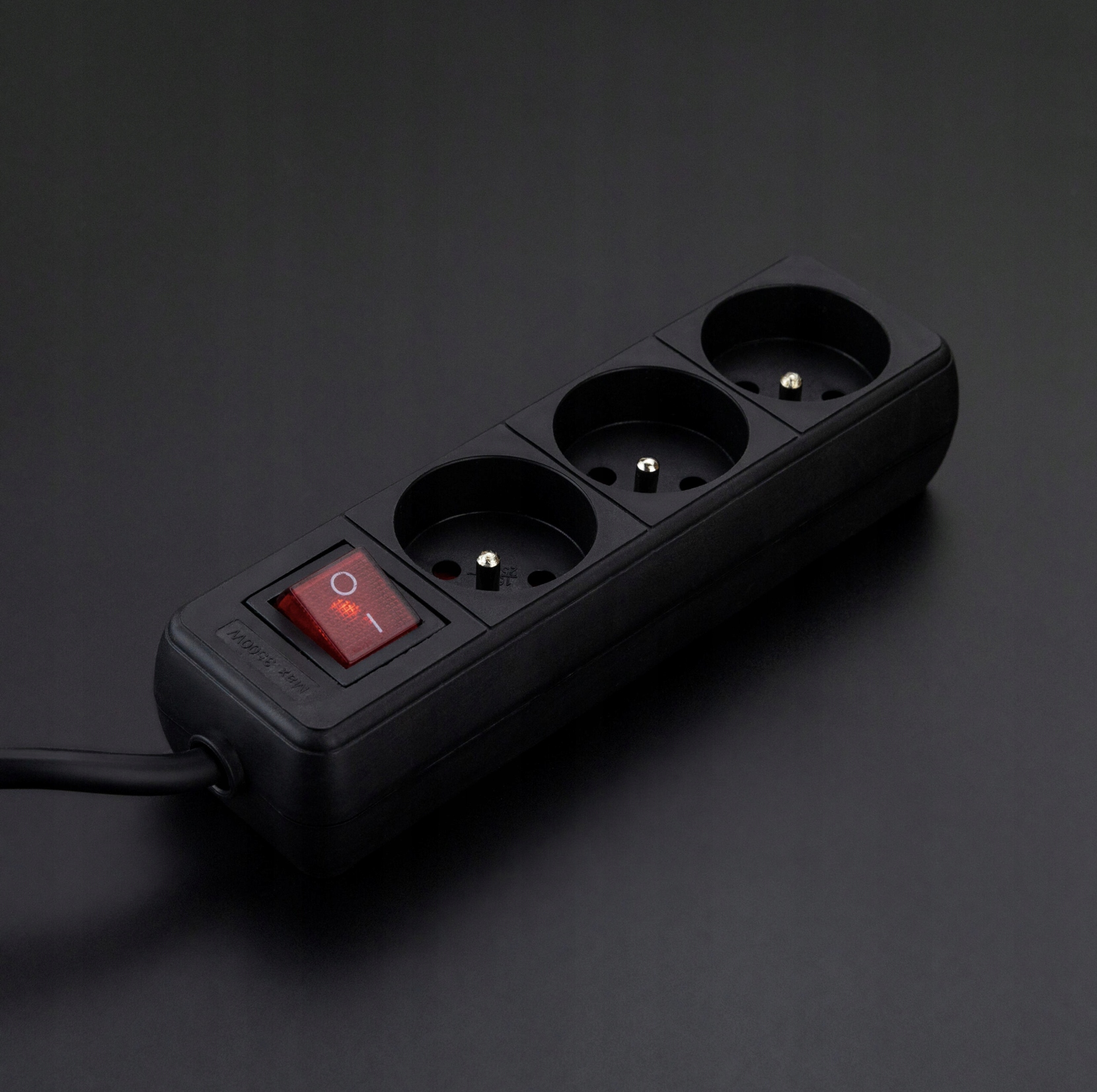 ⭕✅⚒️ Przedłużacz w kolorze czarnym z trzema gniazdami o maksymalnym poborze mocy 3000W.