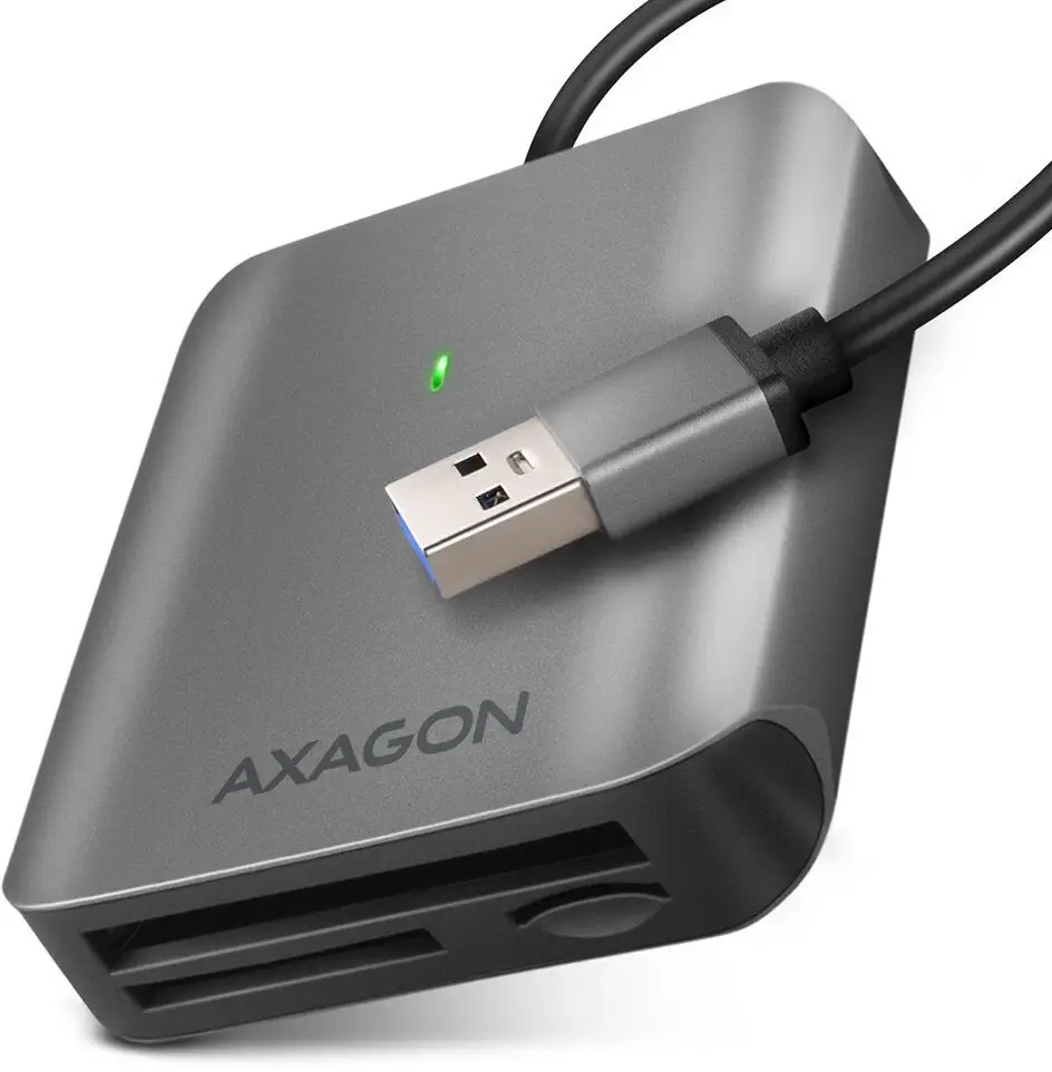 Aluminiowy czytnik kart pamięciowych 3w1 AXAGON CRE-S3 SUPERSPEED z interfejsem USB 3.2 Gen 1 obsługuje wszystkie aktualne wersje kart SD i microSD, w tym SDXC i microSDXC o pojemności do 2TB. Obsługuje również karty CF o pojemności do 128PT.