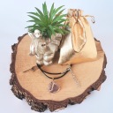 Każdy wisiorek jest pakowany ozdobny woreczek koloru złotego 12x9 cm i posiada kartkę z opisem kamienia w złotej koperciej 7x10 cm