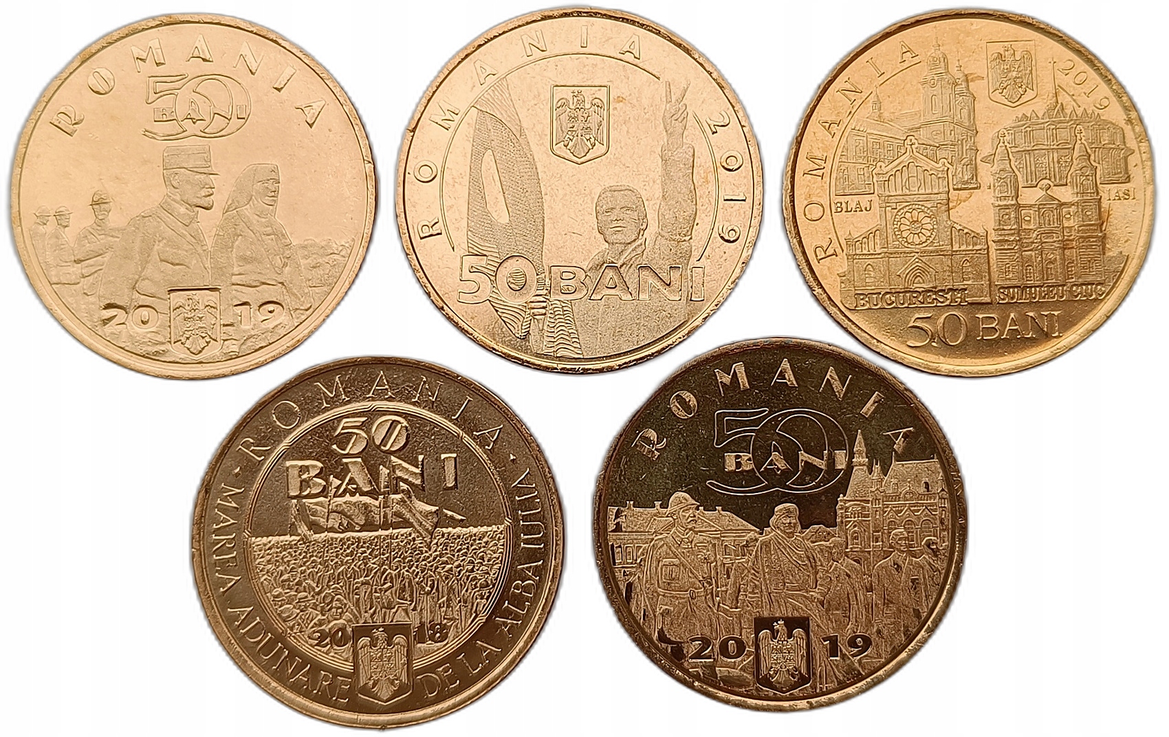 Zestaw pięciu monet okolicznościowych z Rumunii, wyemitowanych w latach 2018–2019, w stanie menniczym (UNC). Monety o nominale 50 bani stanowią część limitowanych emisji poświęconych ważnym wydarzeniom i rocznicom w historii Rumunii. Każda z monet w zestawie upamiętnia istotne momenty z rumuńskiej kultury, tradycji i historii, oferując wyjątkową okazję do wzbogacenia kolekcji o numizmaty o dużej wartości kolekcjonerskiej. Idealny wybór dla pasjonatów numizmatyki.