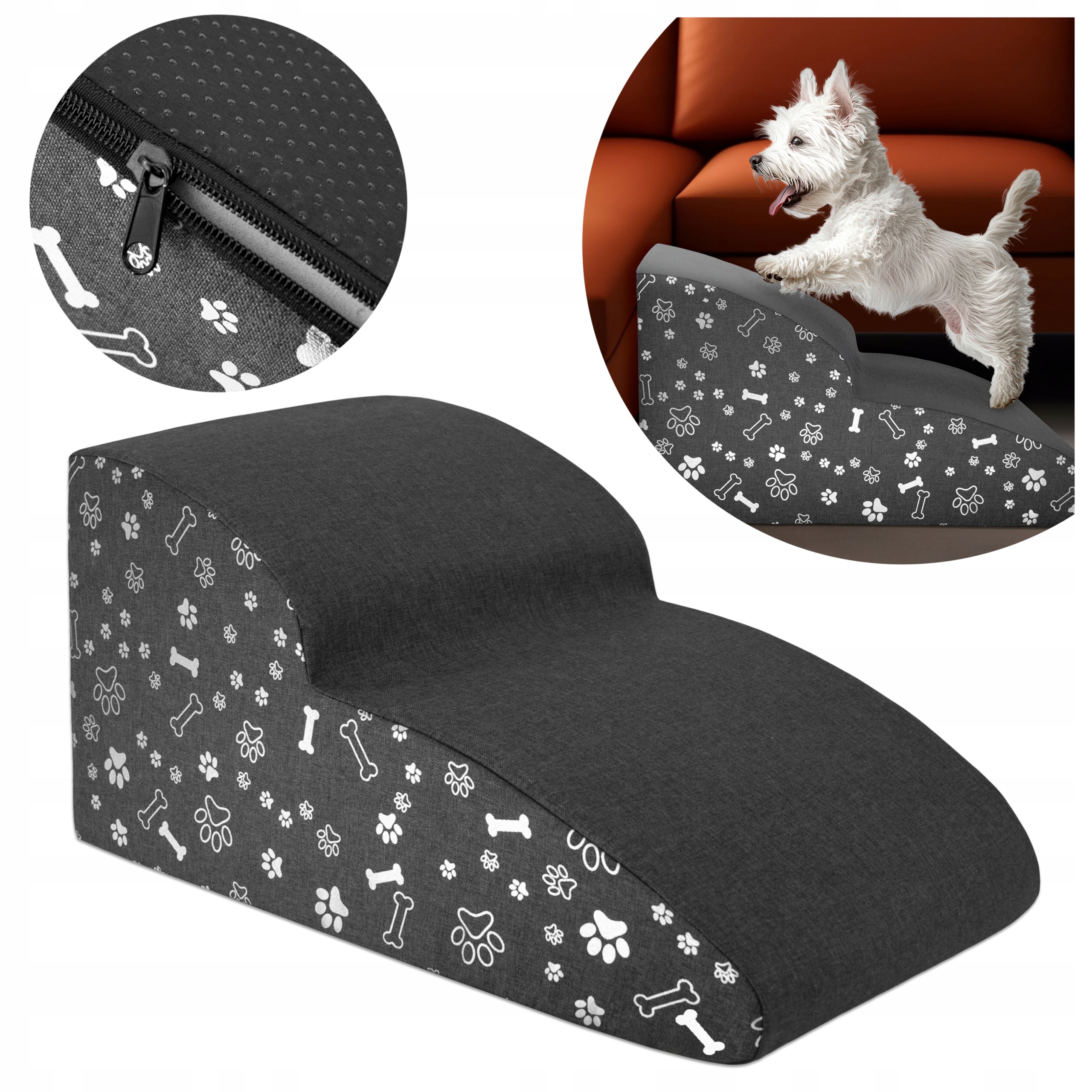Schodki DogGuru są łatwe w utrzymaniu czystości. W razie zabrudzenia wystarczy przetrzeć je wilgotną ściereczką. Dodatkowo, pokrowiec schodków można ściągnąć dzięki wszytemu zamkowi błyskawicznemu i wyprać.