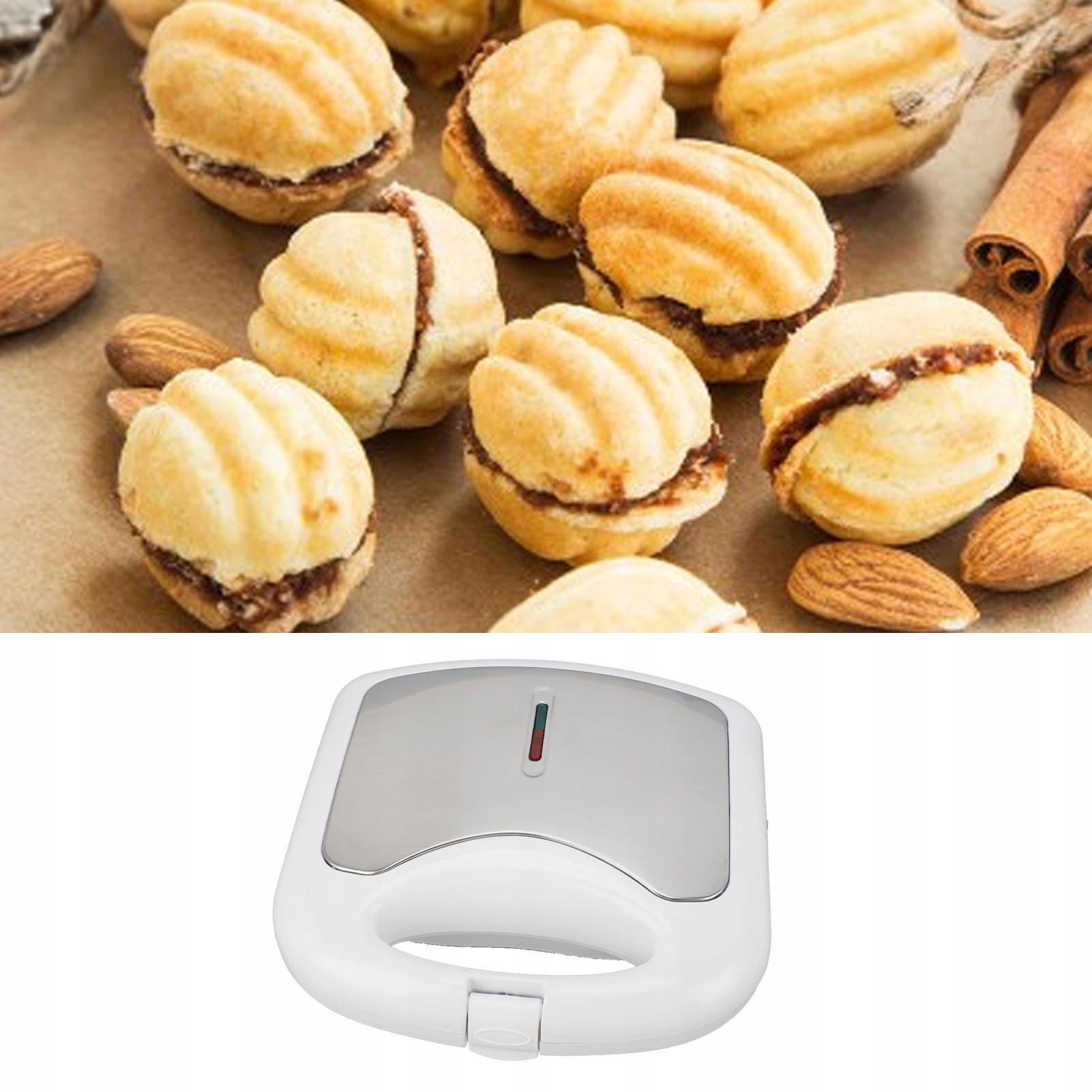 5. CHŁODNY UCHWYT: Maszyna do pieczenia gofrów orzechowych jest wyposażona w bezpieczny w dotyku uchwyt, który zapewnia pewny chwyt i pomaga zapobiegać poparzeniom, zapewniając bezpieczne użytkowanie.