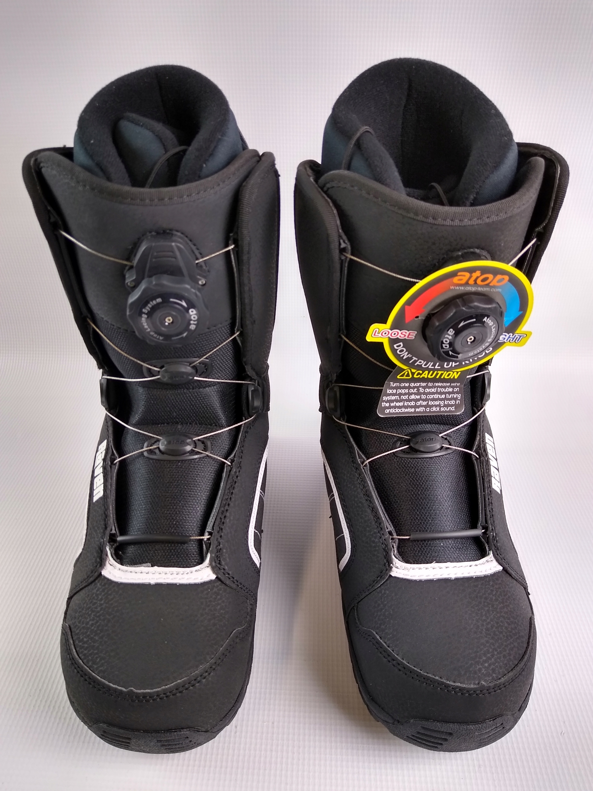 Ослабление и снятие сноубордических ботинок-это так просто поверните ручку ATOP влево (в сторону, противоположную движению по часовой стрелке) на четверть оборота, пока не услышит характерный щелчок - тогда механизм блокировки шнура освобождается, и вы можете вручную раздвинуть верх обуви, растягивая ссылки.