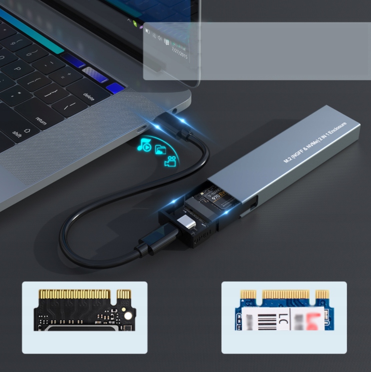 Корпус к диску можно подключить как к разъему USB-C или Thunderolt 3.0 / 4.0, а также к стандартному разъему USB 2.0/3.0.