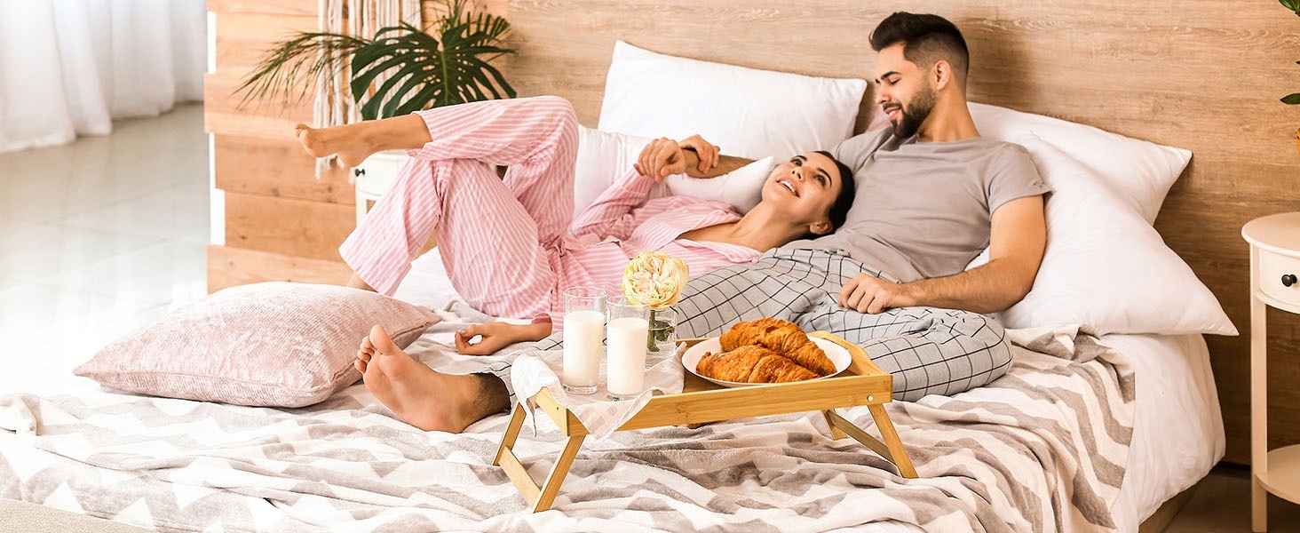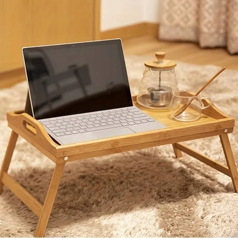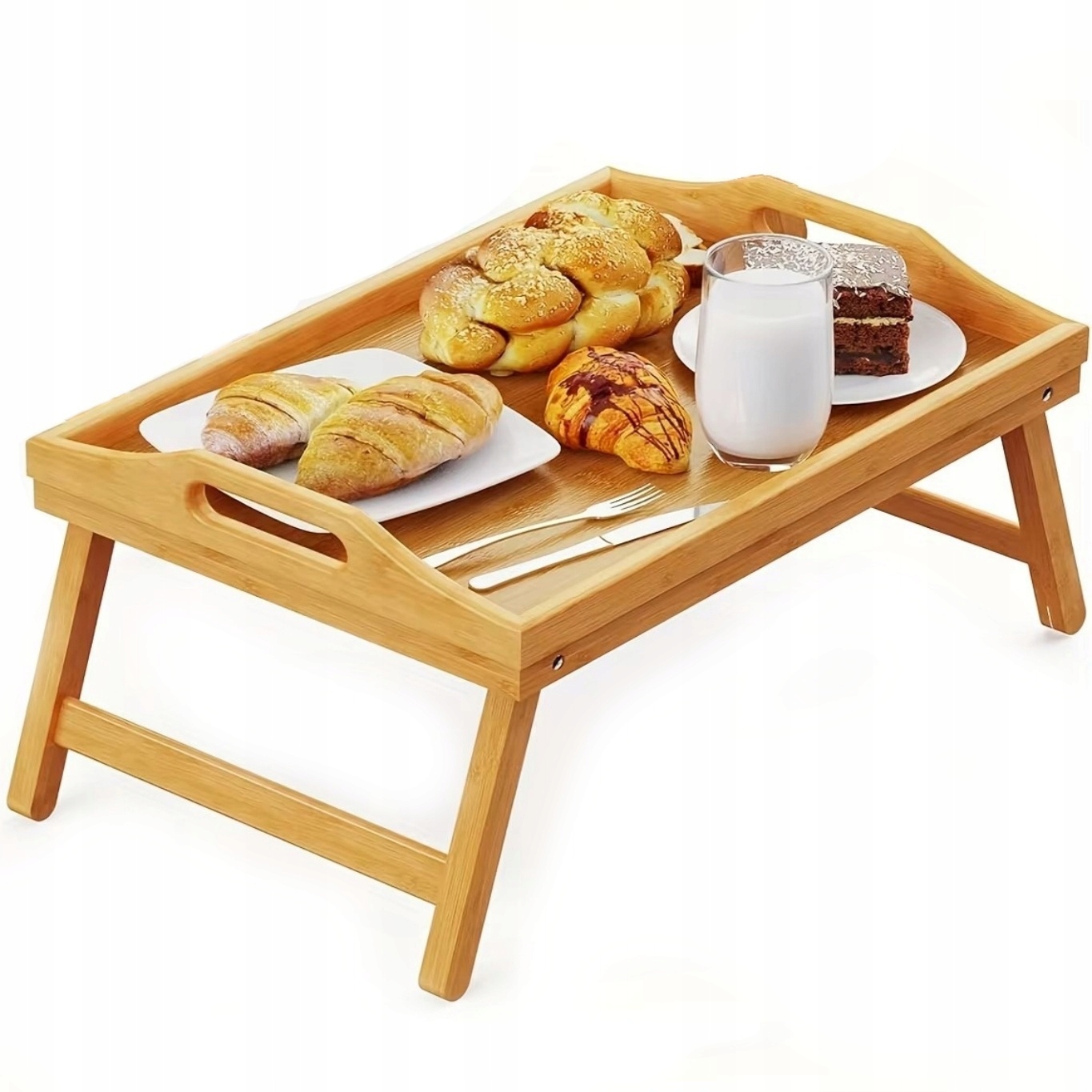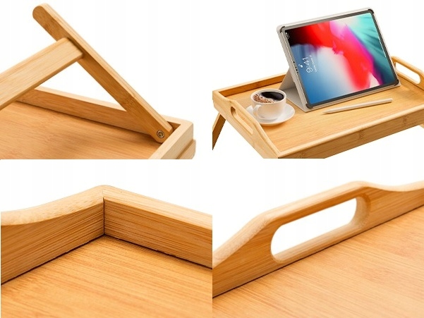 Taca śniadaniowa, biurko na laptopa, stół do serwowania herbaty.