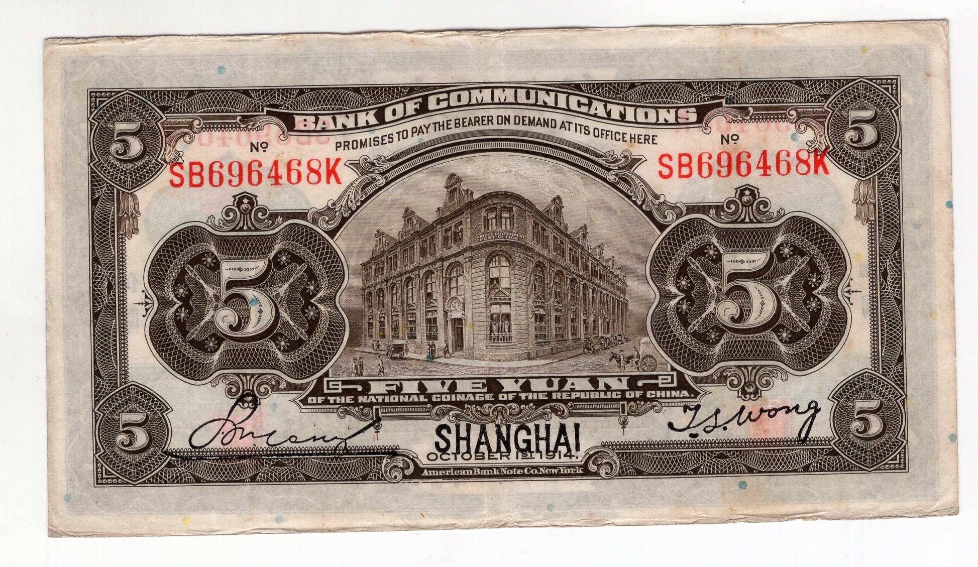 Chiny, Szanghai, Bank of Communications, 5 yuan 1914