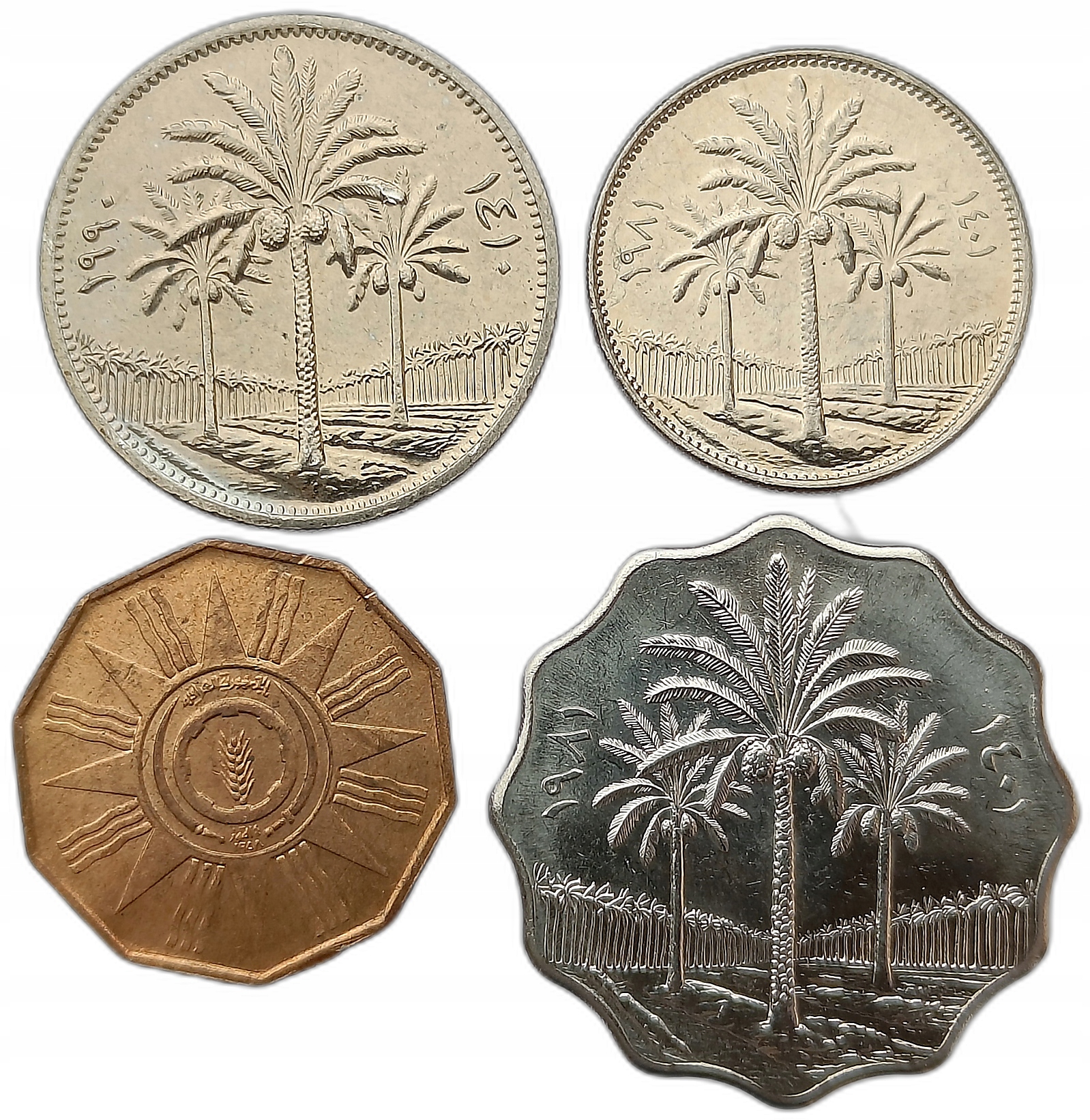 Zestaw 4 monet Iraku w nominałach od 1 do 50 fils, wydanych w latach 1959-1990. Monety te przedstawiają wizerunki palm, które stanowią symbol regionu i jego kultury. Wykonane w metalu nieszlachetnym, w stanie menniczym, bez śladów używania. Awersy przedstawiają palmowe motywy, natomiast rewersy zawierają nominał i inne charakterystyczne elementy. Monety w bardzo dobrym stanie, bez widocznych uszkodzeń.